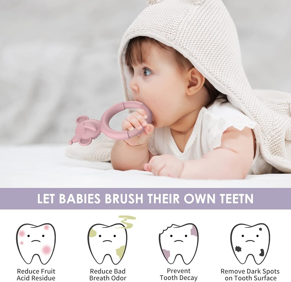 🍒 ألعاب مضغ ناعمة ومرنة للأطفال: ألعاب الأطفال المصنوعة من السيليكون ناعمة ومرنة، وتعتني بفم الطفل الحساس، مما يجعلها لطيفة على لثة وأسنان طفلك الحساسة. عند المضغ، فإن ترك الطفل ينظف أسنانه بنفسه يمكن أن يقلل من الأحماض العضوية المتبقية، ويزيل رائحة الفم الكريهة والروائح الكريهة، ويمنع التسوس، ويزيل البقع السطحية على الأسنان.