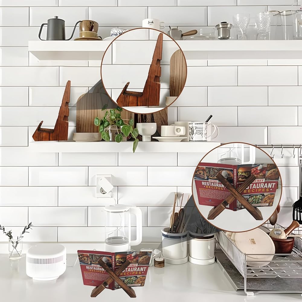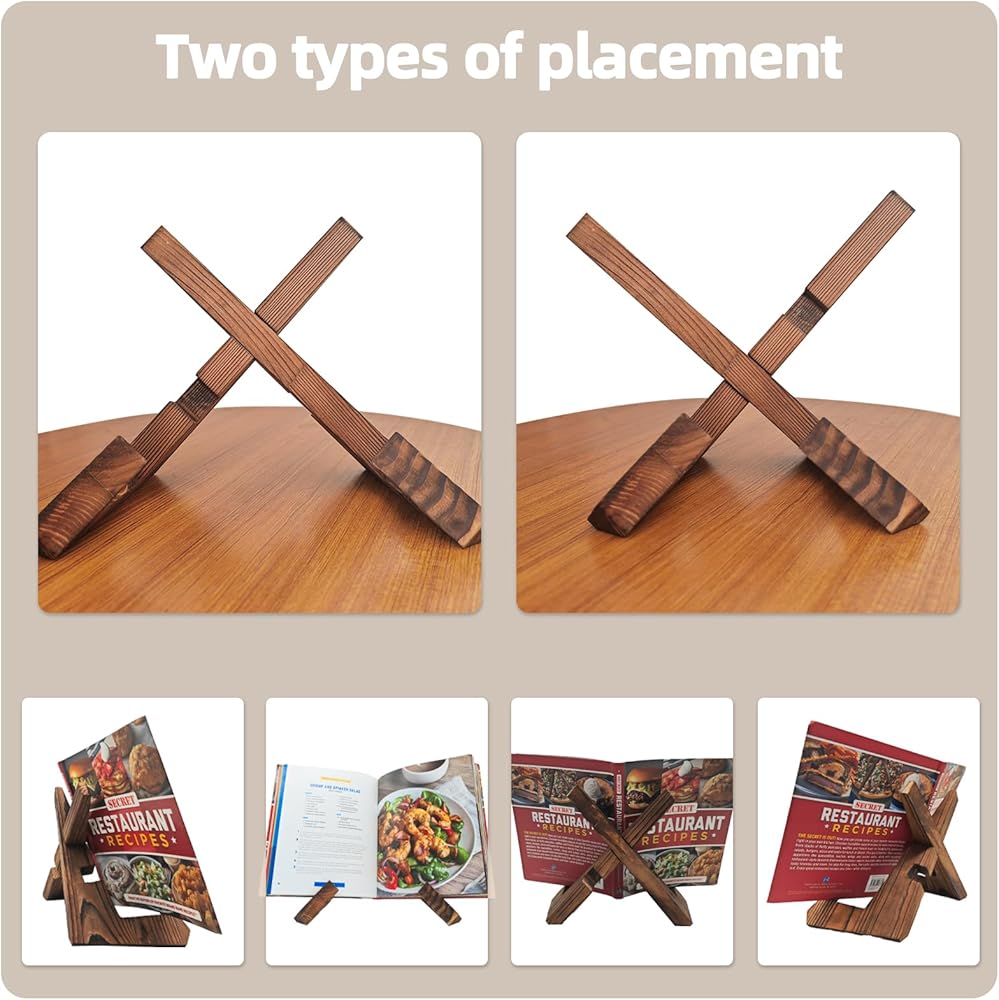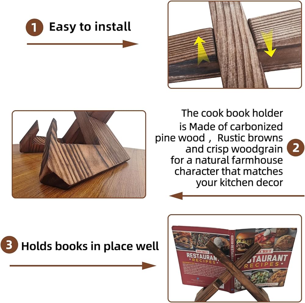 FARMHOUSE STYLE: The cook book holder is Made of carbonized pine wood ,Rustic browns and crisp woodgrain for a natural farmhouse character that matches your kitchen decor