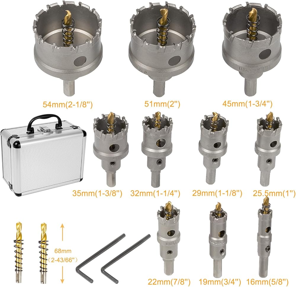 عبوة شاملة: تحتوي هذه المجموعة على 10 مناشير ثقب تي سي تي، و2 لقمة مثقاب إرشادية إضافية مطلية بالتيتانيوم، و2 مفتاح ربط سداسي، جميعها مخزنة بدقة في صندوق ألومنيوم رائع. كل لقمة مزيتة لمنع الصدأ. إنها هدية ممتازة لك ولعائلتك.