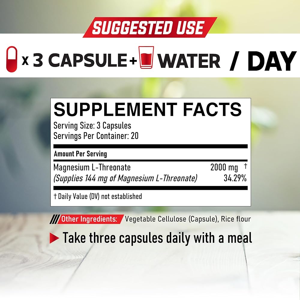 ☑️ Ideal Daily Intake: Consume 3 daily capsules, delivering 2000mg of Magnesium L-Threonate. 2Packs 60 capsules, enough to accompany you through 40 days of wellness. Our Magnesium pills offer versatility. Easy to use and suitable for vegetarians.