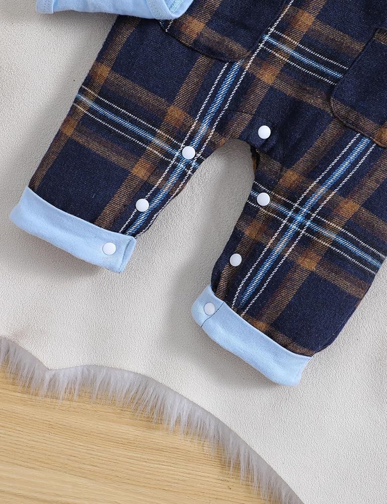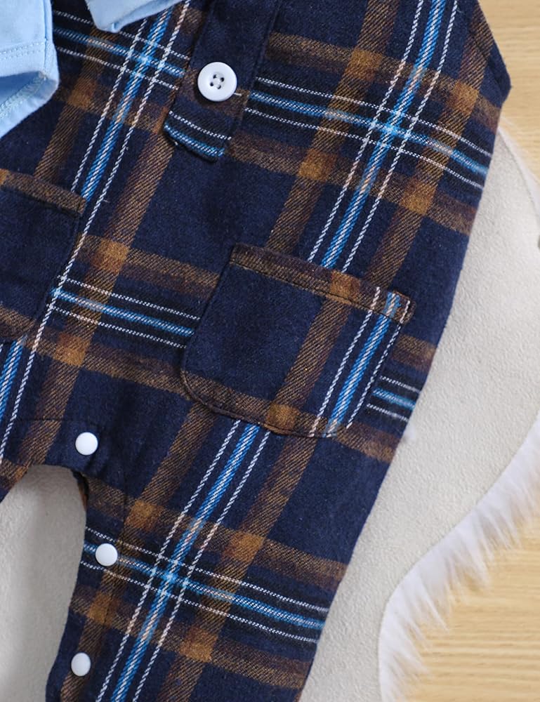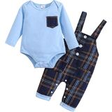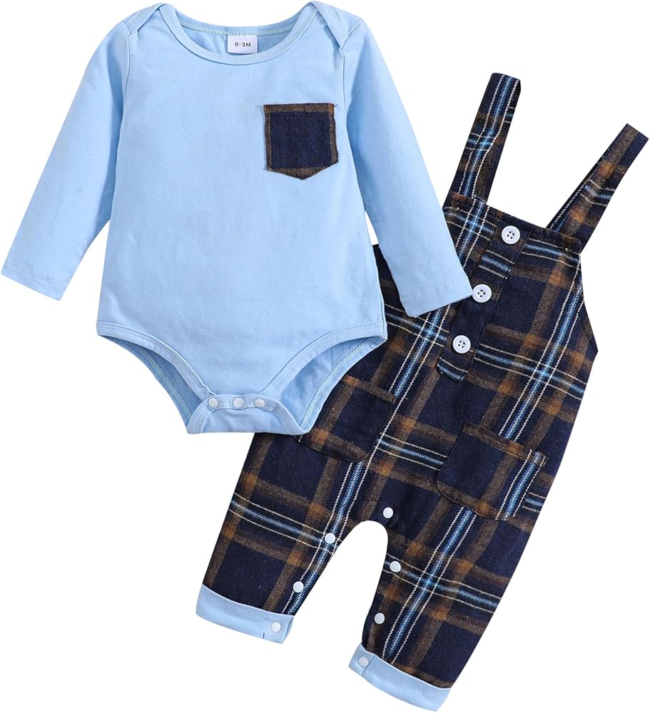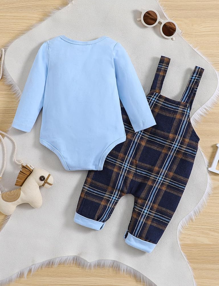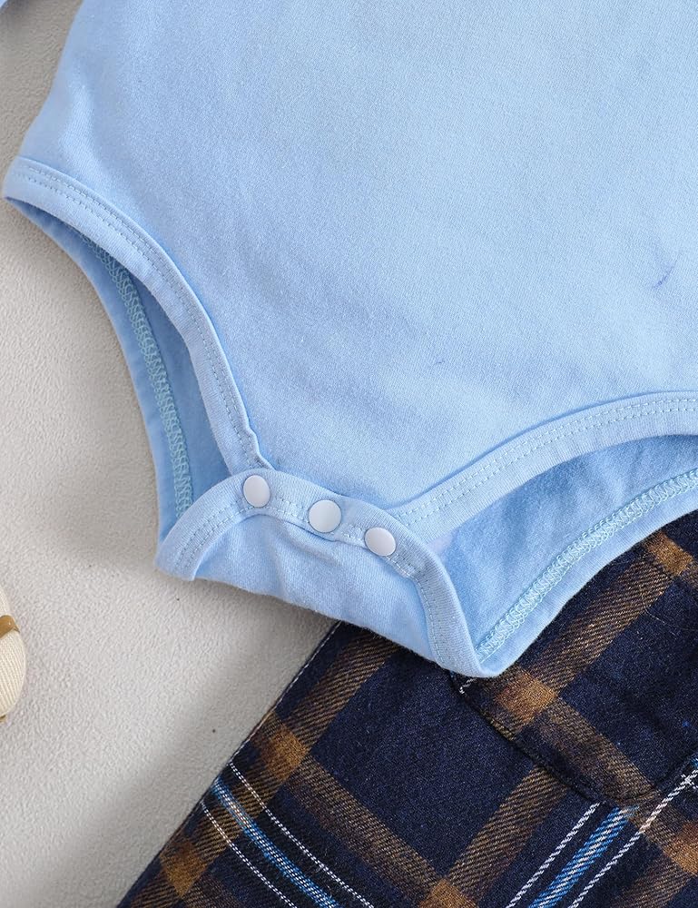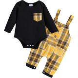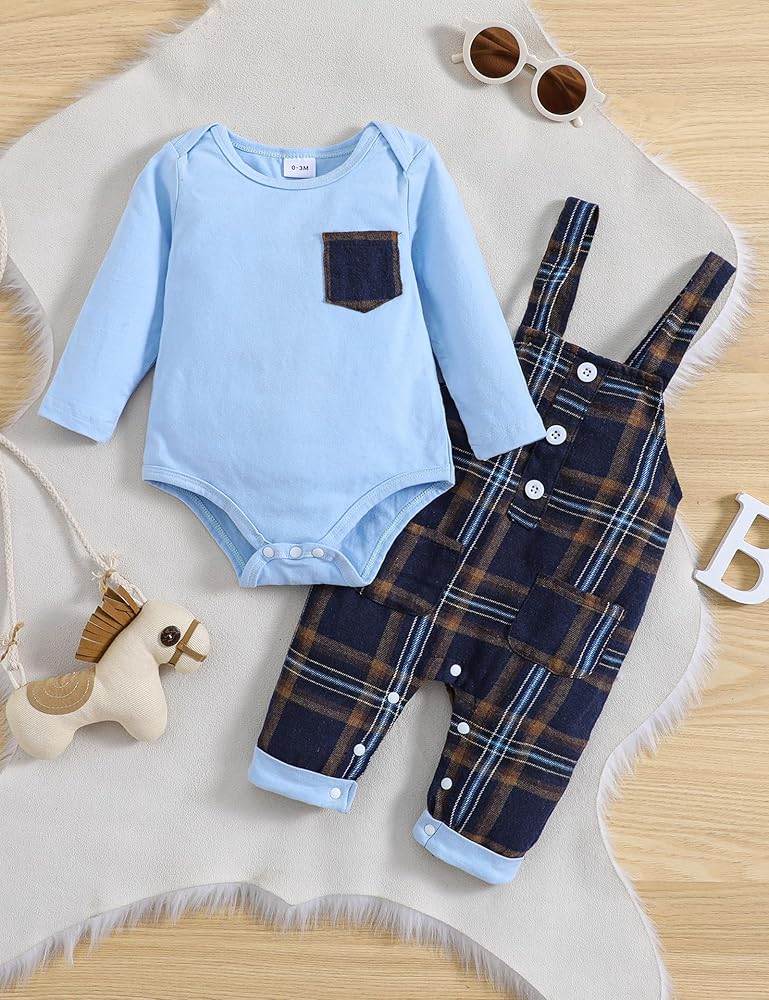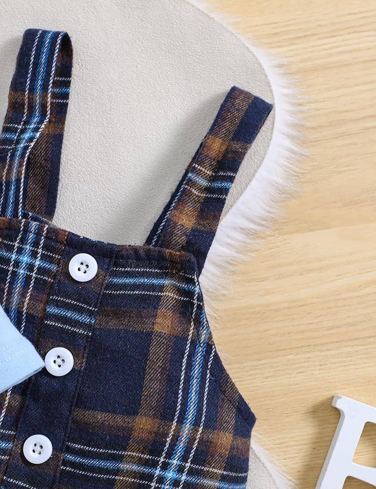 - تشمل العبوة: 1 × قطعة علوية بلون سادة + 1 × بنطلون بحمالات منقوش.