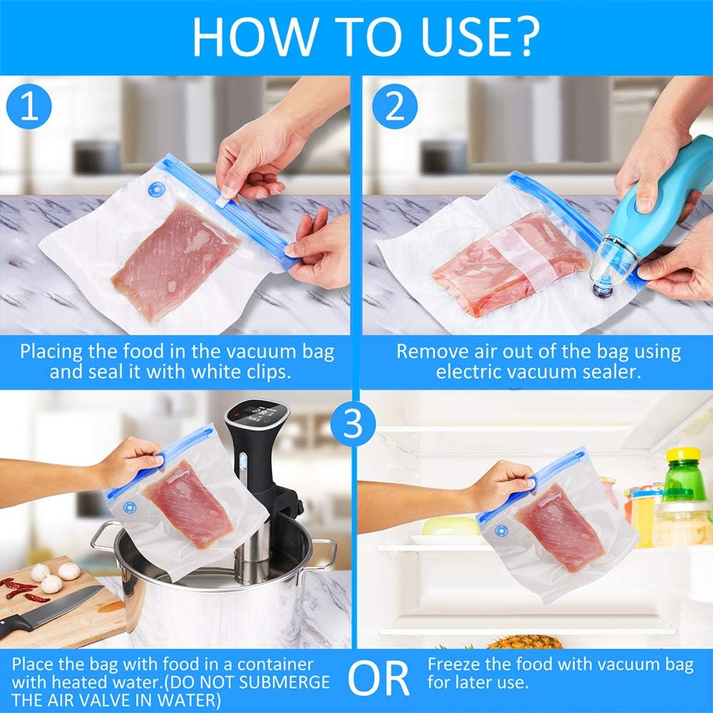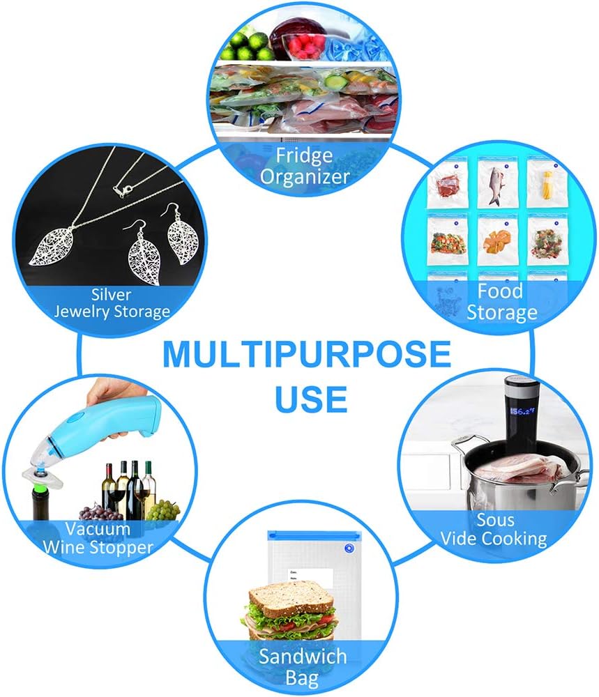 ★توفير المال وختم الطزاجة ★ما يصل إلى 5 مرات أطول من طرق التخزين العادية، يعتبر جهاز الغلق المحمول باليد جهاز مطبخ مثالي لحماية الطعام المجمد من حروق التجميد وفقدان النكهة. يمكن شطف الأكياس وإعادة استخدامها حتى 15 مرة. تحتوي كل حقيبة على ملصق لكتابة تاريخ تخزين الطعام وانتهاء الصلاحية.