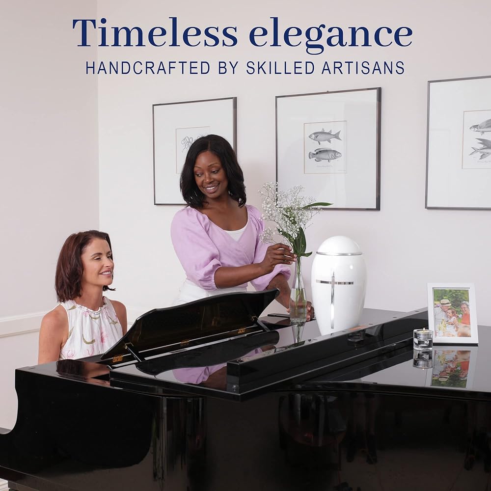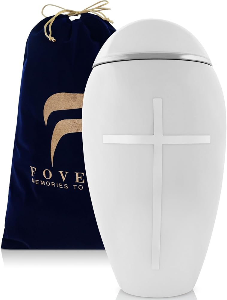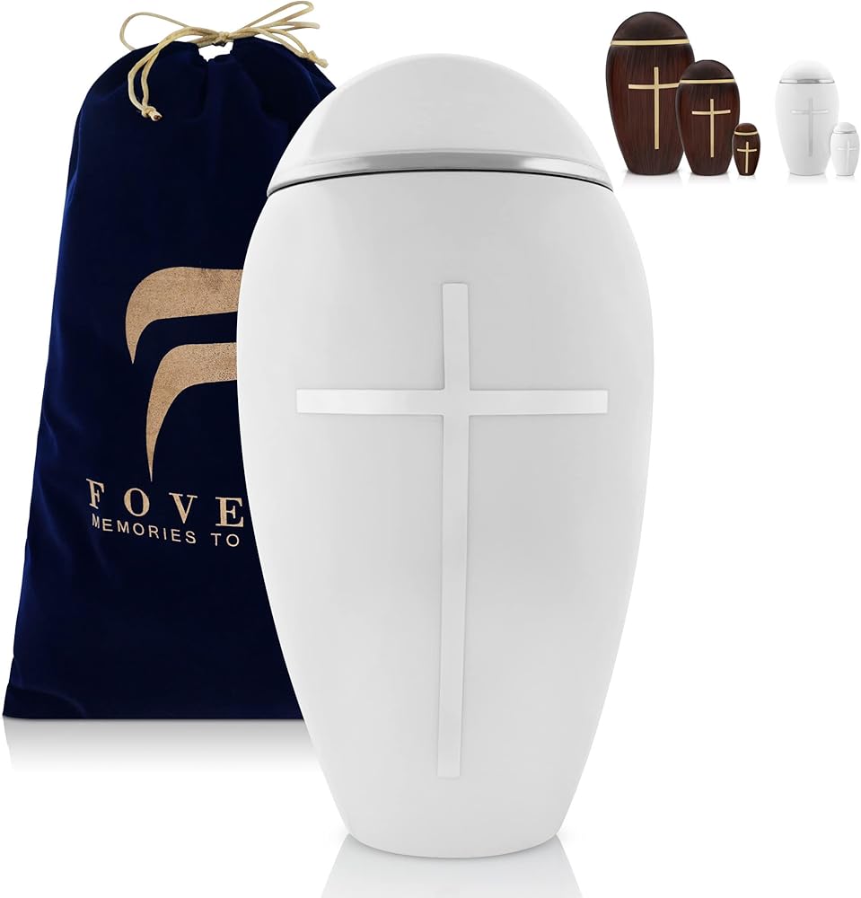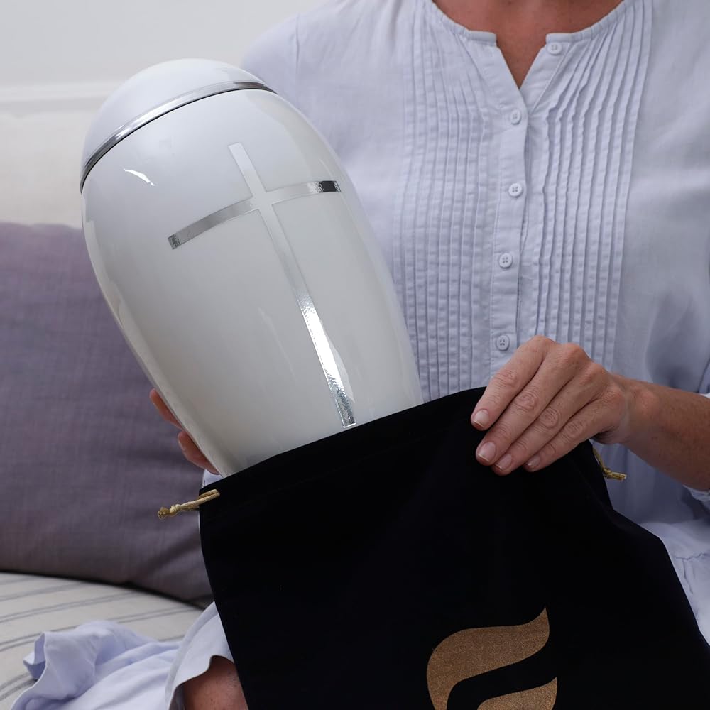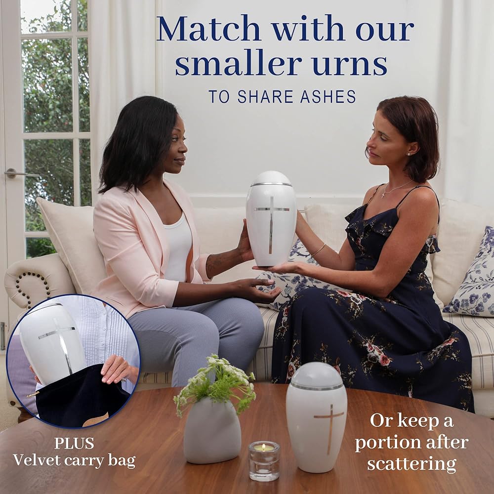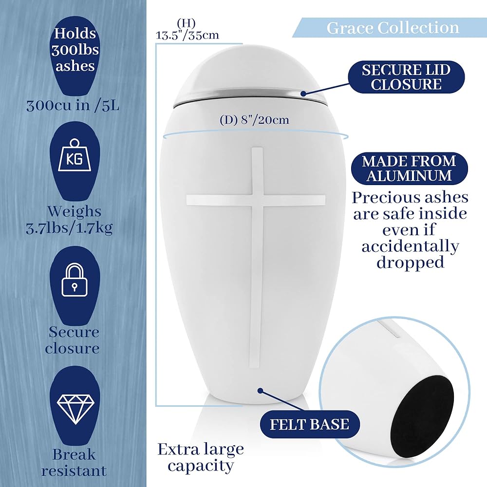 جرار حرق جثث بيضاء كبيرة للرماد البشري للبالغين من الذكور والإناث - جرار جنازة بالحجم الكامل مع صليب فضي أنيق يحمل ما يصل إلى 300 رطل - جرة زخرفية مصنوعة يدويًا بنسبة 100% للرماد