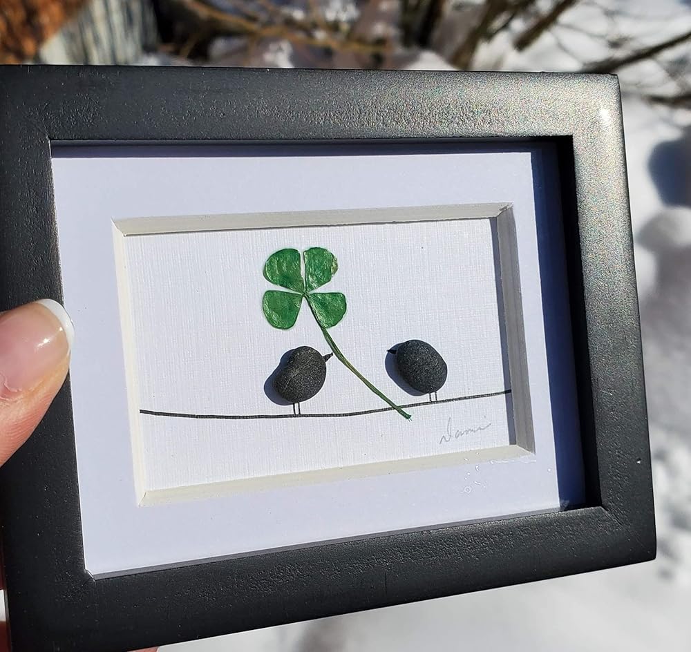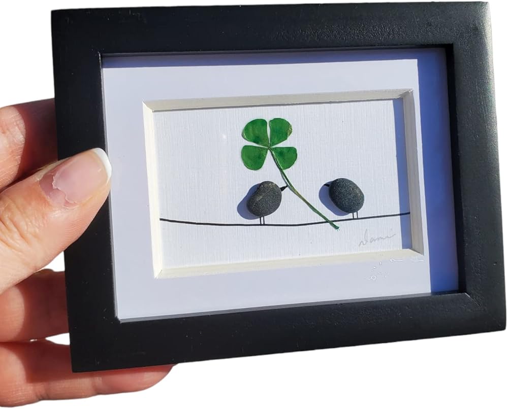 فن البرسيم ذو الأربع أوراق. فن مكتب صغير. إطار صغير رائع مع البرسيم المضغوط وطيور الحصى الصغيرة. 4 × 3.5 بوصة، صنع في ماين، الطريقة المثالية لتقديم هدية الحظ للأيرلنديين! فن الحصى.