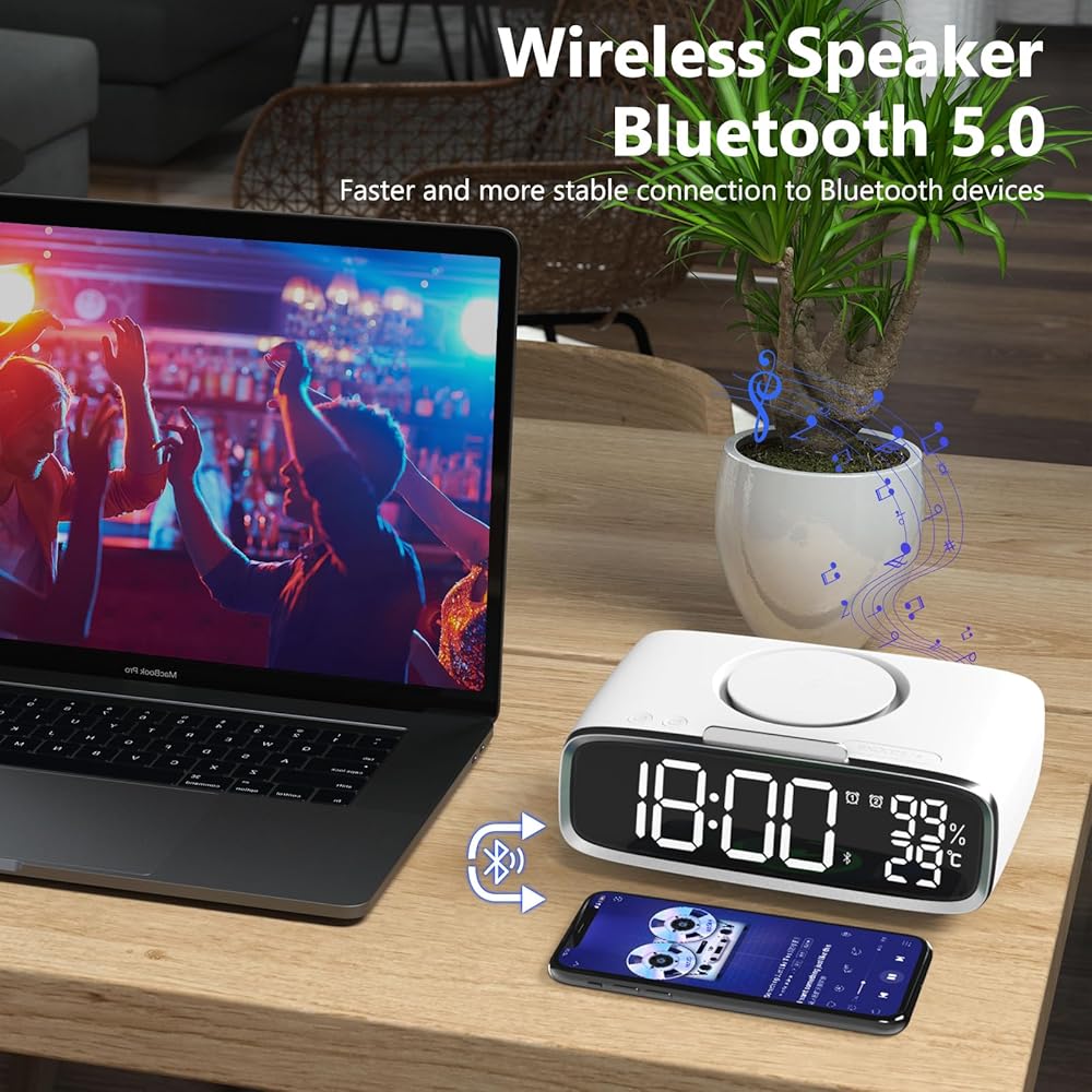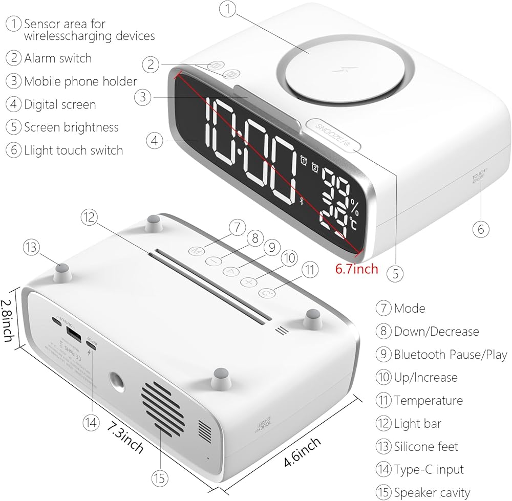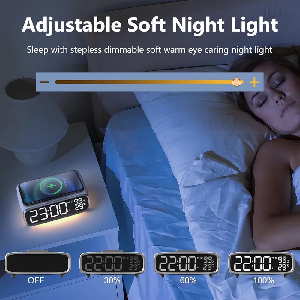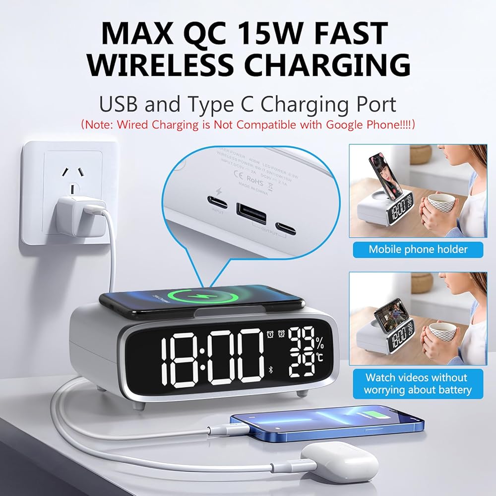 【مع شحن لاسلكي سريع】إنذار رقمي Clcok مجهز بلوحة شحن سريعة لاسلكية بقدرة 15 وات للهواتف الذكية التي تدعم تقنية Qi. وداعًا للكابلات الفوضوية والأسلاك المتشابكة. مع منافذ USB وType-C الإضافية (ملاحظة: الشاحن السلكي غير متوافق مع هاتف Google!!!)، يمكنك شحن جميع الأجهزة بسهولة. ومن الجدير بالذكر أن لوحة الشحن اللاسلكية تعمل أيضًا كحامل للهاتف، وتحول ساعة المنبه الخاصة بك إلى مركز ترفيه بدون استخدام اليدين.