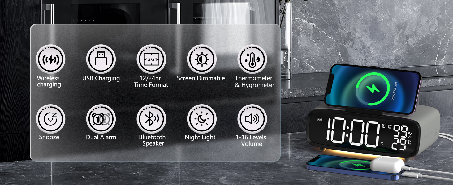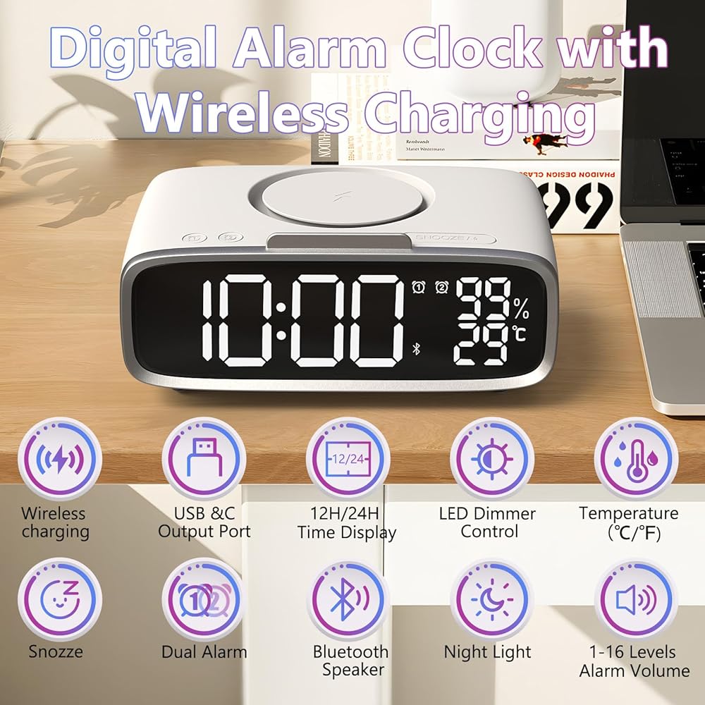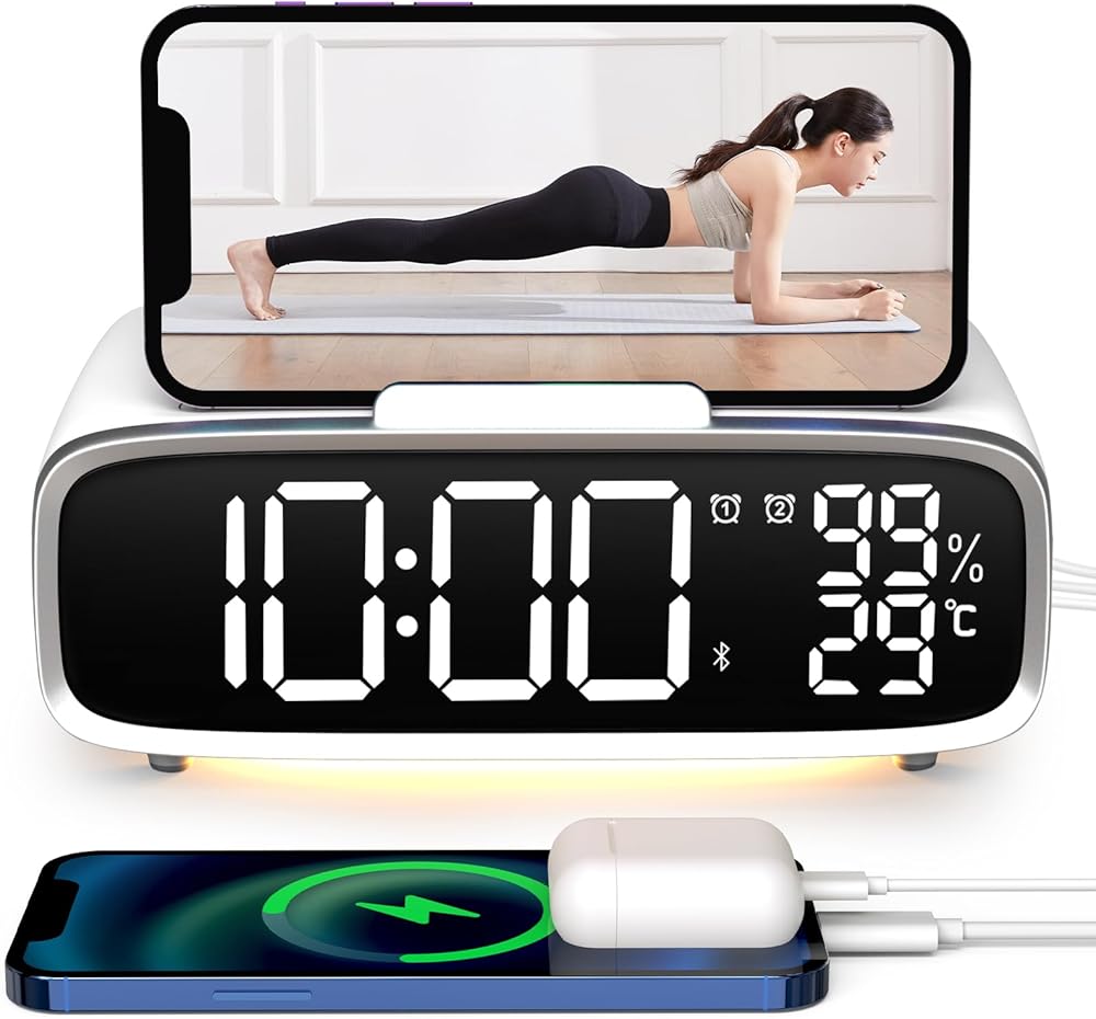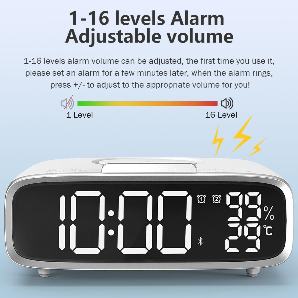 【مع شحن لاسلكي سريع】إنذار رقمي Clcok مجهز بلوحة شحن سريعة لاسلكية بقدرة 15 وات للهواتف الذكية التي تدعم تقنية Qi. وداعًا للكابلات الفوضوية والأسلاك المتشابكة. مع منافذ USB وType-C الإضافية (ملاحظة: الشاحن السلكي غير متوافق مع هاتف Google!!!)، يمكنك شحن جميع الأجهزة بسهولة. ومن الجدير بالذكر أن لوحة الشحن اللاسلكية تعمل أيضًا كحامل للهاتف، وتحول ساعة المنبه الخاصة بك إلى مركز ترفيه بدون استخدام اليدين.
