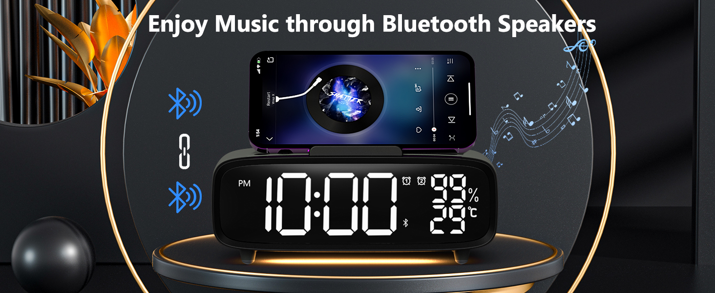 【مكبر صوت حديث وبلوتوث 5.0 】استعد لتجربة المزيج المثالي من الجمال والتكنولوجيا الحديثة مع ساعة المنبه الرقمية هذه. يجمع تصميمه الأنيق بين الخطوط النظيفة والمنحنيات الناعمة، مما يخلق قطعة مذهلة بصريًا لغرفة النوم أو غرفة المعيشة. تتميز ساعة المنبه الرقمية أيضًا بمكبر صوت Bluetooth 5.0، مما ينقل تجربتك الصوتية إلى مستوى جديد تمامًا. من خلال الاتصال السلس، يمكنك بث الموسيقى أو الملفات الصوتية أو الكتب الصوتية المفضلة لديك لاسلكيًا من جهاز Bluetooth الخاص بك.