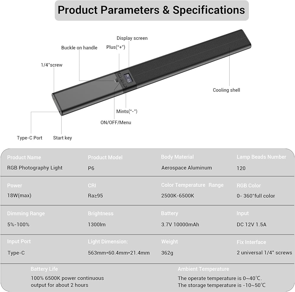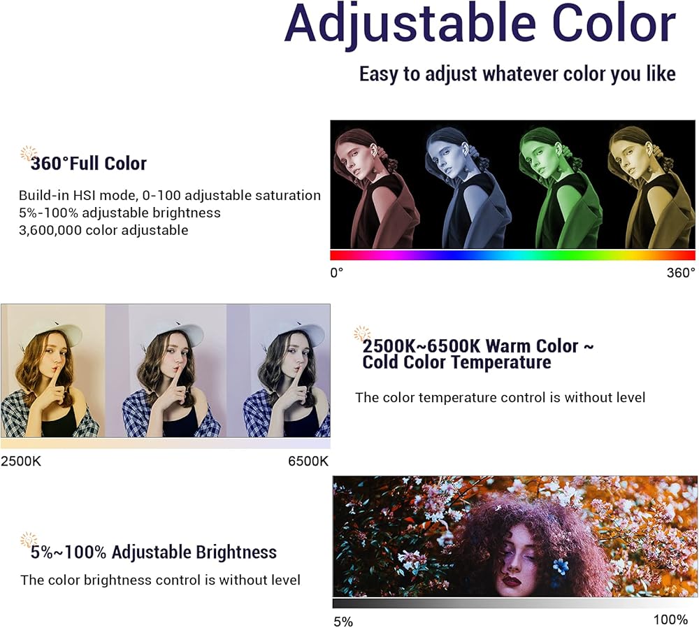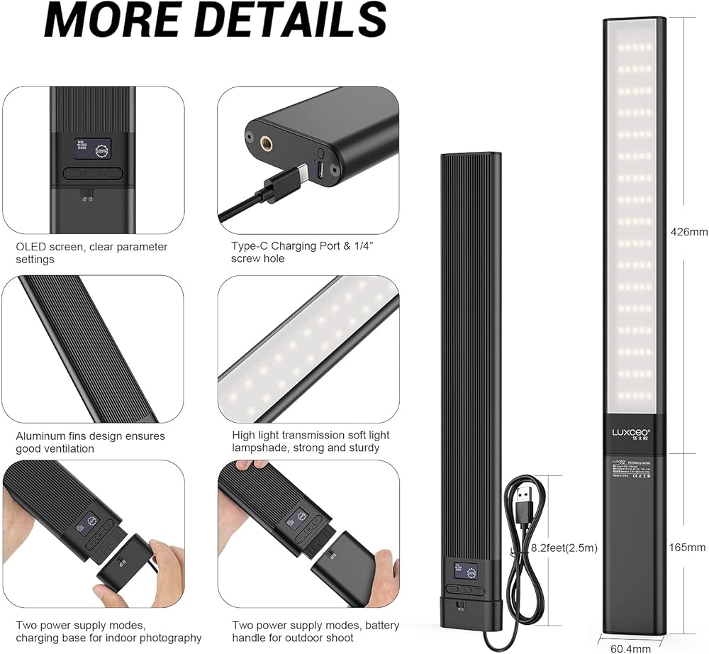 إضاءة RGB أفضل: مدمج مع أوضاع عملية مختلفة في عصا الإضاءة المحمولة هذه، المستوى الأكثر سطوعًا يصل إلى 1300 لومن، CRI: Ra>95+، درجة حرارة قابلة للتعديل من 0 - 360، تشبع قابل للتعديل من 1%-100%، سطوع من 5%-100% قابل للتعتيم، درجة حرارة اللون من 2500 كلفن (دافئ) إلى 6500 كلفن (بارد) خافت مقر. بدون وميض. مصباح فيديو LED مزود بشاشة OLED لقراءات دقيقة، بهدف الوصول إلى تصور تعديل المعايير.