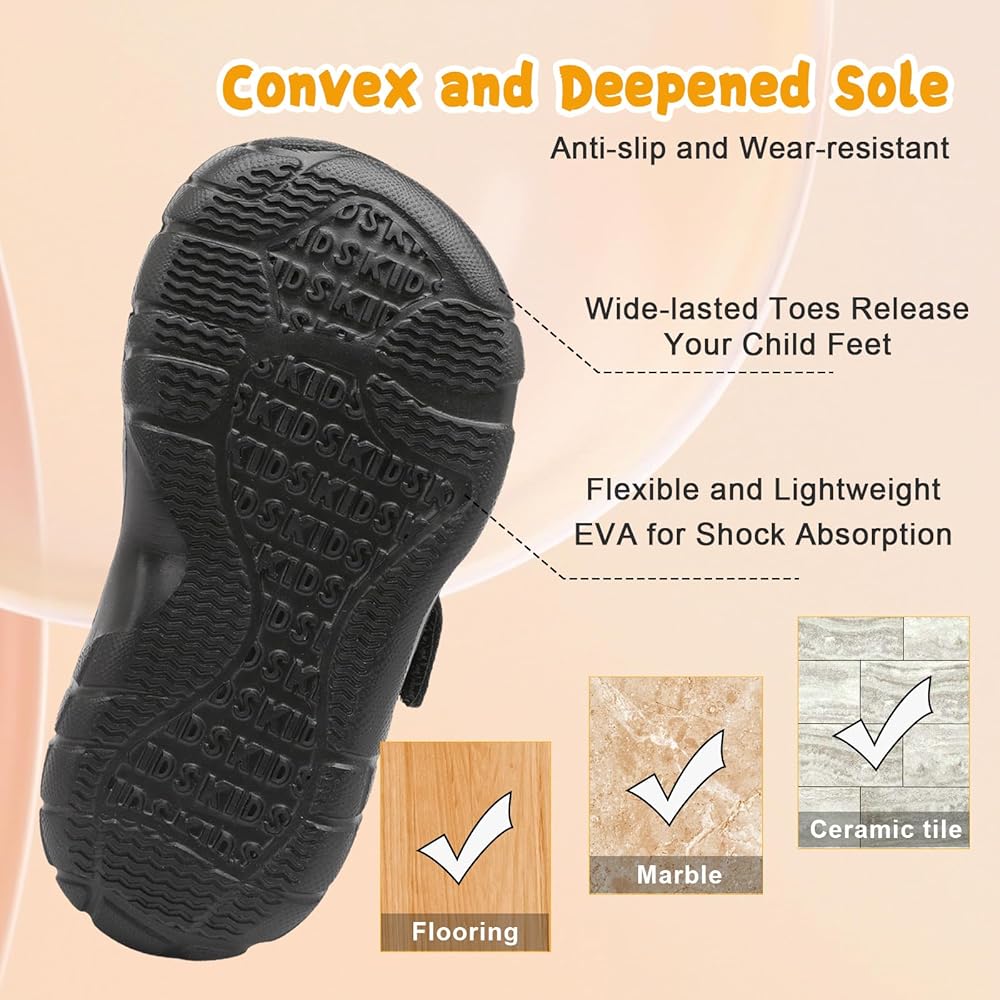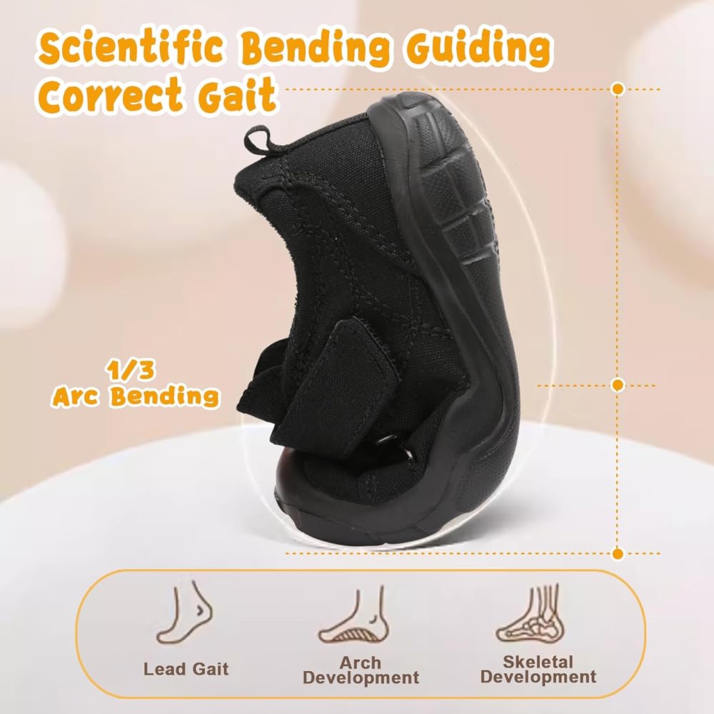 نعل قابل للارتداء مانع للانزلاق: نعل خارجي متين من مادة إي في إيه يتميز بقوة احتكاك ومقاومة للتآكل، ويمنع طفلك من الانزلاق، ويساعد الطفل على تعلم التوازن عندما تمسك أصابع قدميه بالأرض. نعل داخلي سميك على شكل قرص العسل، يضيف المزيد من الراحة عند المشي أو الجري