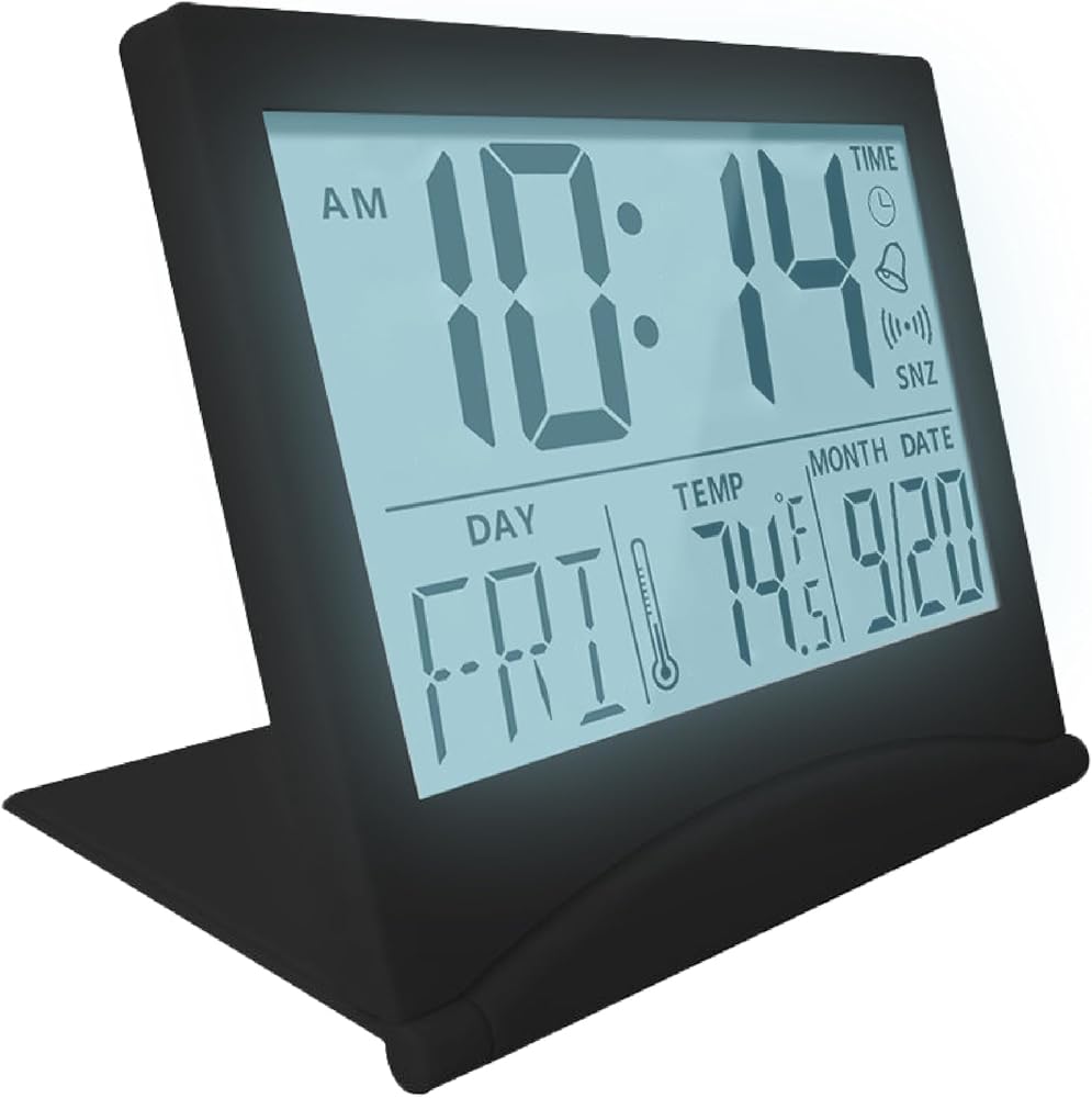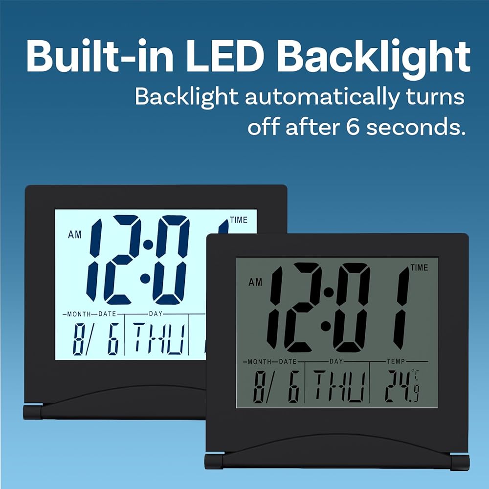 When folded, the alarm clock measures 8 x 8,5 x 1 cm (3.15 x 3.35 x 0.39 inches), making it very portable. This compact design makes the alarm clock perfect for travel or just for daily use at home.