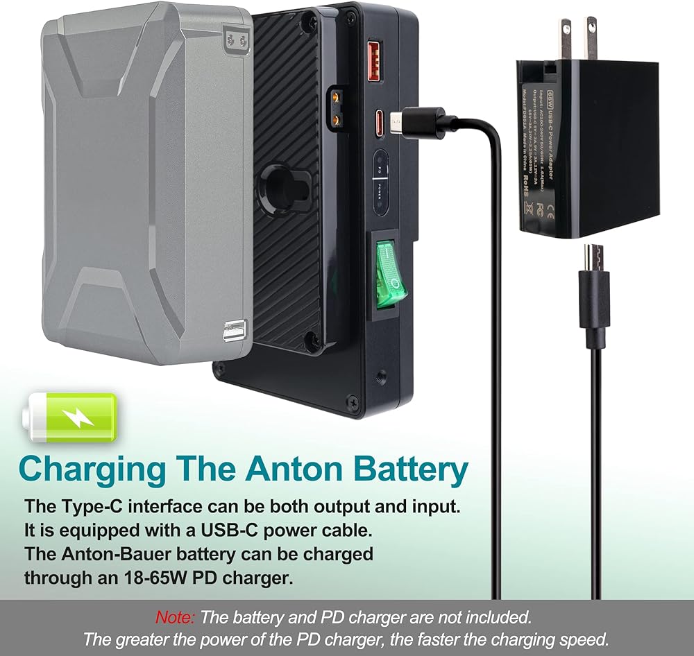 ★ يمكن أن تكون الواجهة من النوع C الإخراج والإدخال. مزود بسلك طاقة يو اس بي - سي. يمكن شحن بطارية Anton-Bauer Gold Mount عبر لوحة البطارية وشاحن PD 18-65 وات. يمكن أن تعمل لوحة البطارية بشكل طبيعي عند الشحن. (ملاحظة: الشاحن PD غير متضمن، كلما زادت قوة الشاحن PD، كلما زادت سرعة الشحن)