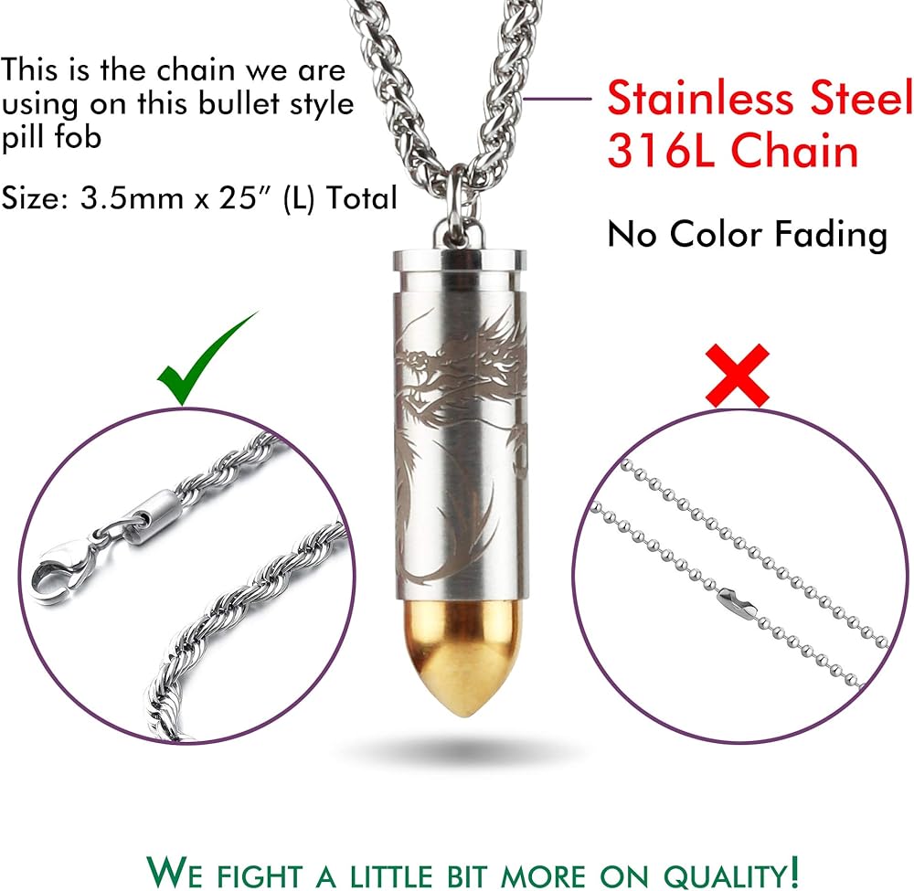 【Easy to carry】 - This pill dispenser is equipped with an additional Keychain and a 25 "long 3.2mm thick stainless steel necklace, which can easily connect this small pill box to the Keychain, belt, backpack or hang on your body.
