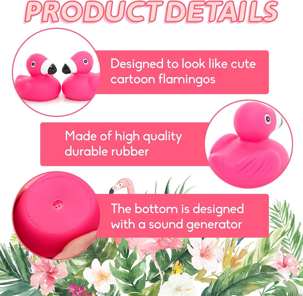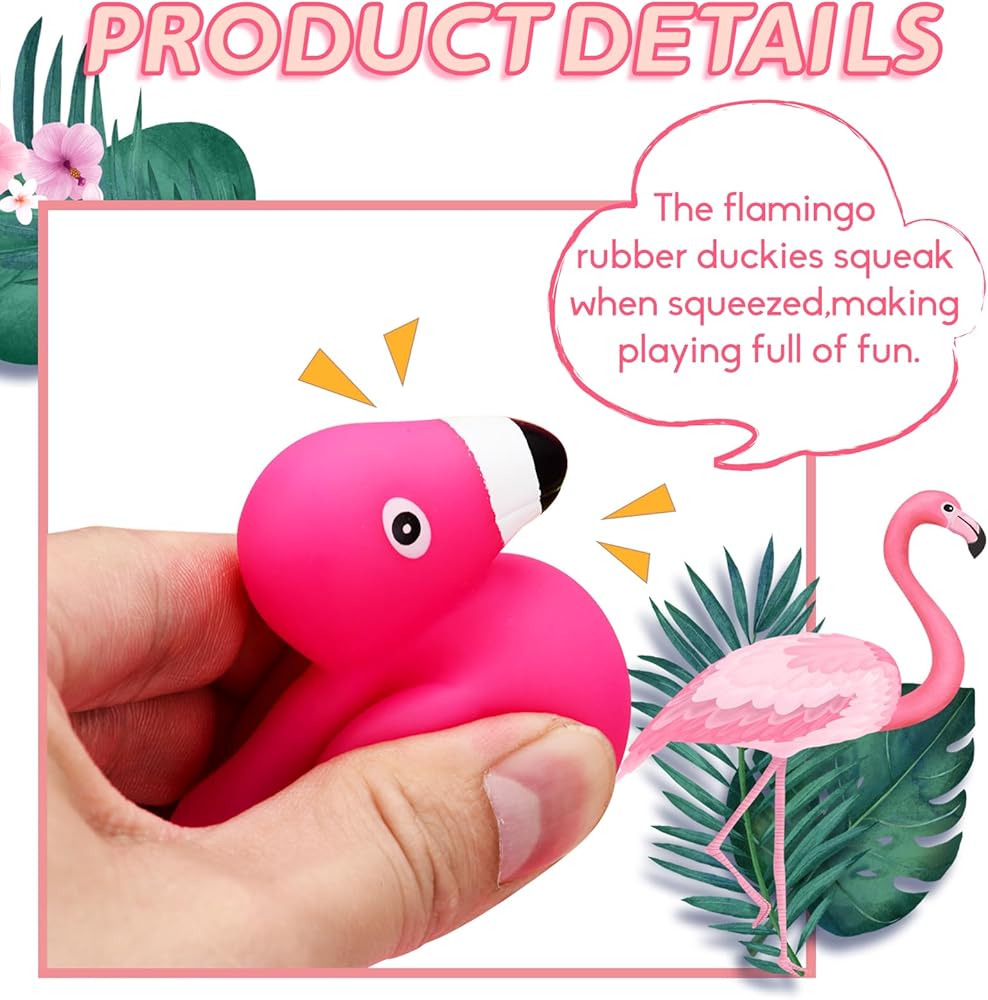 Cute Appearance and Funny Sound:These flamingo rubber duckies are designed to look like cartoon flamingos,brightly colored,lifelike and very cute.They squeak when squeezed,making playing full of fun.