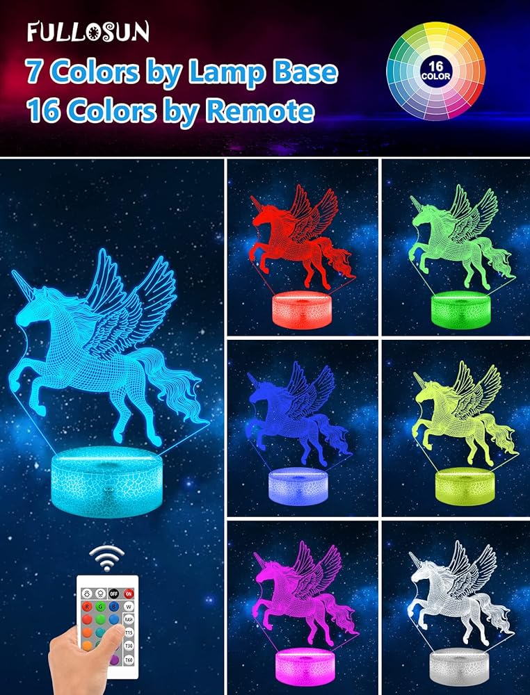 فولوسن هدايا يونيكورن للشوايات، مصباح ليلي وهمي ثلاثي الابعاد بجانب السرير مع جهاز تحكم عن بعد 16 لون متغير وظيفة خافتة، هدايا ابداعية للغرفة/ديكور المنزل واعياد الميلاد للاولاد والبنات