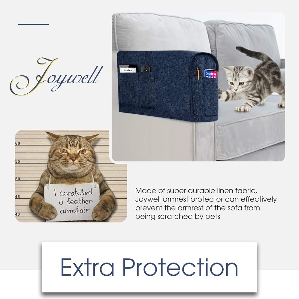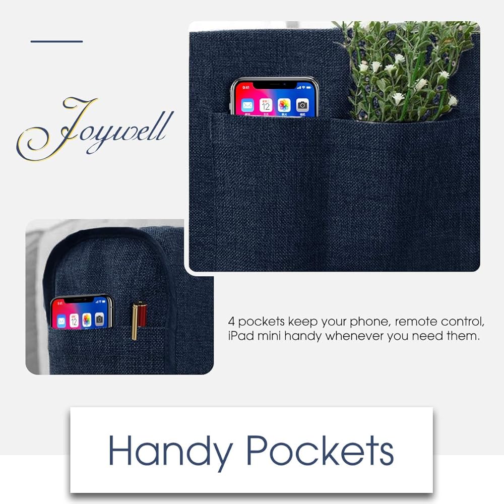 Joywell Linen Armrest Covers for Living Room Anti-Slip Sofa Arm Protector for Dogs, Cats, Pets Armchair Slipcover for Recliner with 4 Pockets for TV Remote Control, Phone, Set of 1, Navy