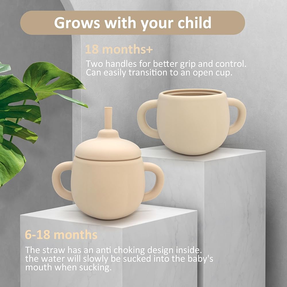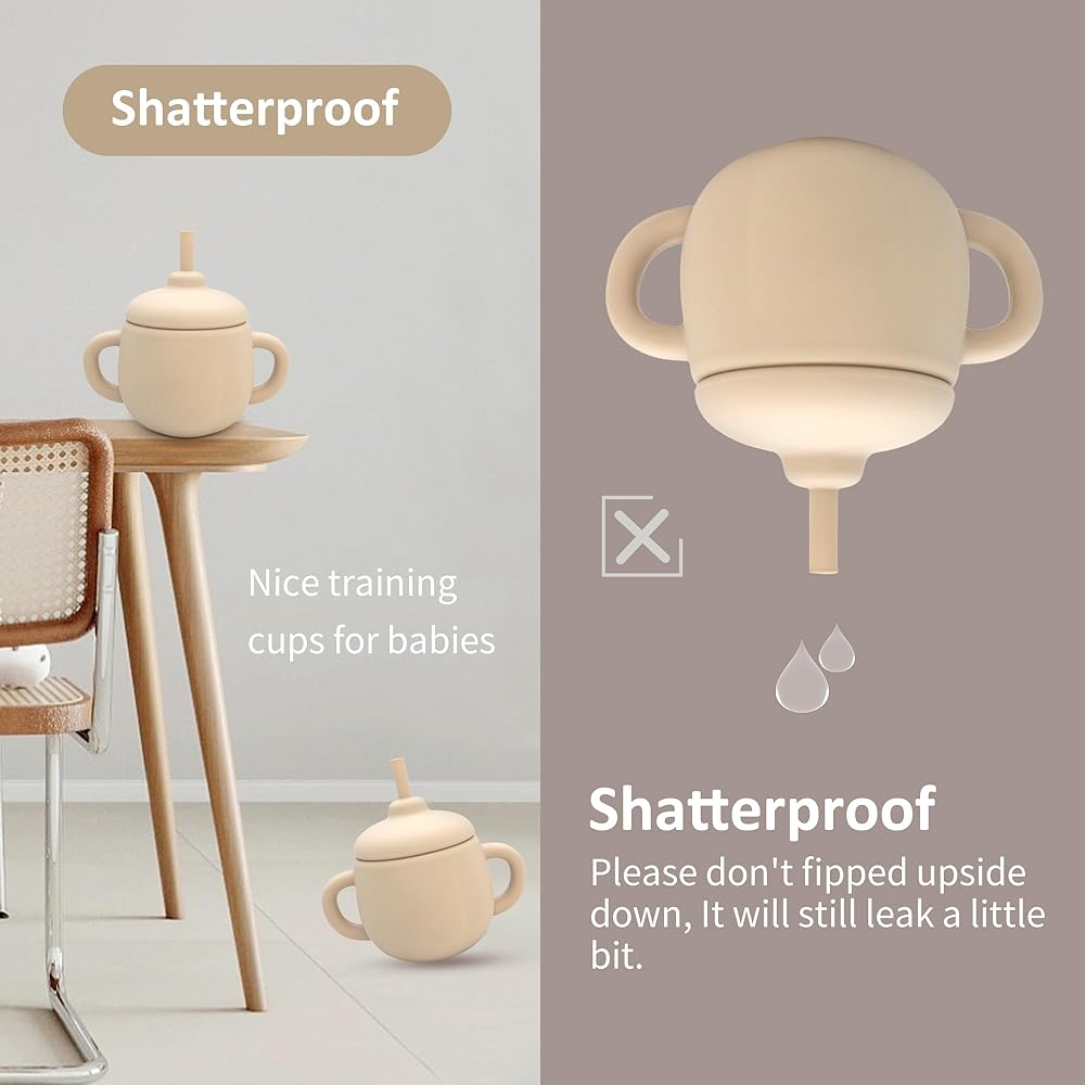 【أكواب مضادة للتسرب】 كوب مضاد للانسكاب من السيليكون محكم الغلق ولا ينكسر بسهولة عند سقوطه، والتصميم الملولب بين الغطاء والكوب يجعل من الصعب على طفلك فتحه، ولكن فم المصاصة مناسب للأطفال. الطفل الذي يشربه غير مغلق؛ إذا تم قلبه رأسًا على عقب، فقد تتدفق كمية صغيرة من الماء، ولكن لن يكون هناك تسرب خطير.