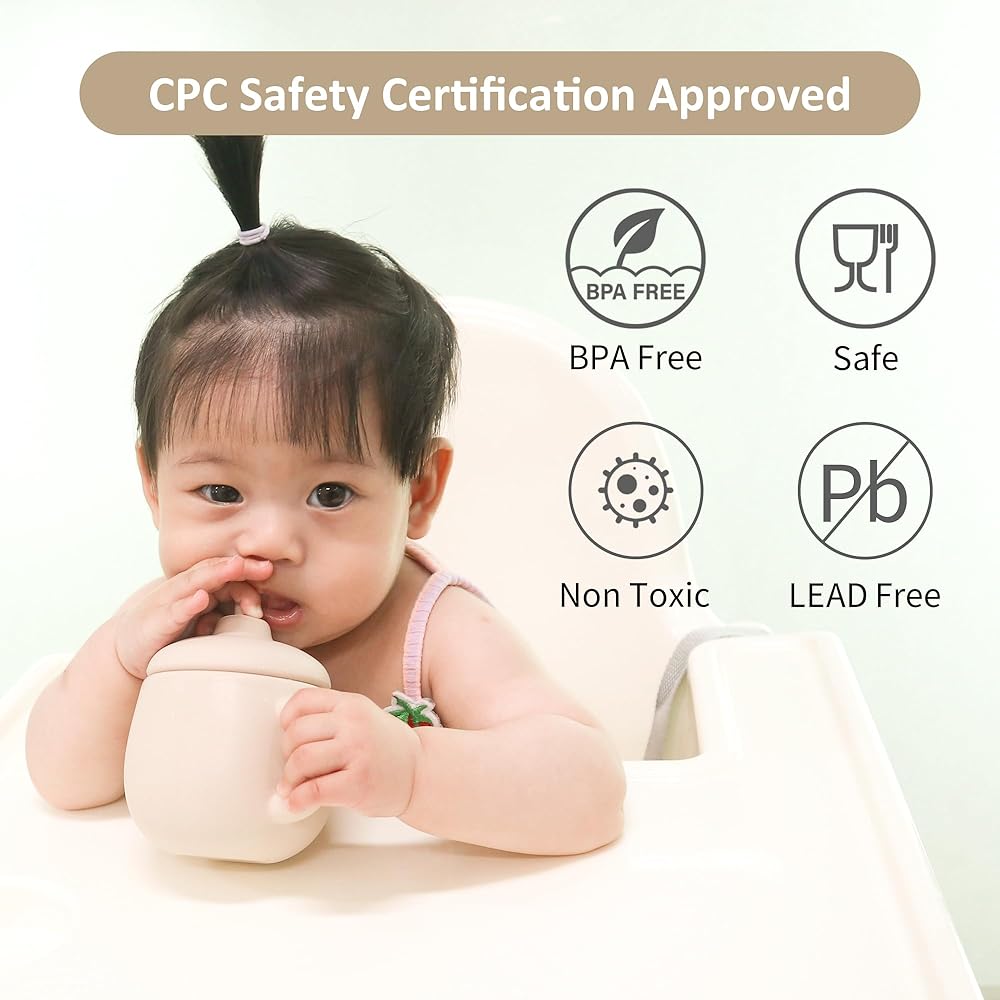 【السلامة أولاً 】 كوب الأطفال الرضع مصنوع من مادة السيليكون الغذائية عالية الجودة. لقد تم اختباره بدقة من خلال معايير CPSIA وCSPA المعتمدة، وشهادة CPC (شهادة منتج الأطفال). سلامة طفلك وراحة بال أمك تعني أكثر بالنسبة لنا.