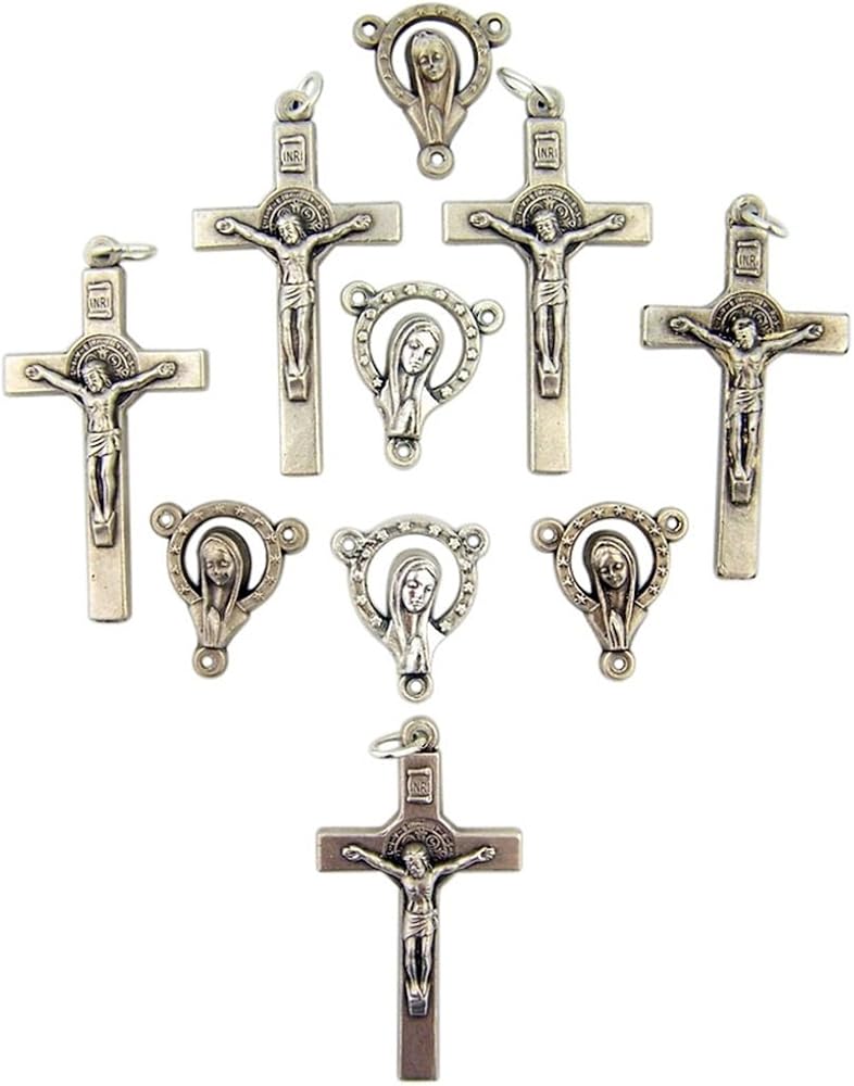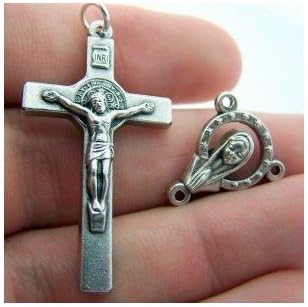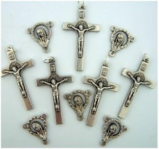 هدايا دينية فضية لهجة سانت بينديكت كروسيفيكس مع مسبحة سانت ماري من قطعة مركزية، مجموعة من 10، 1 1/2 بوصة