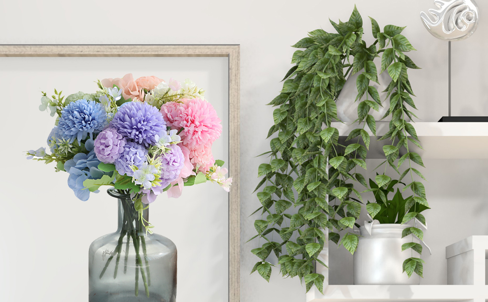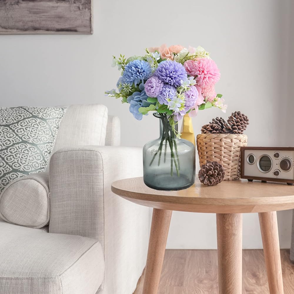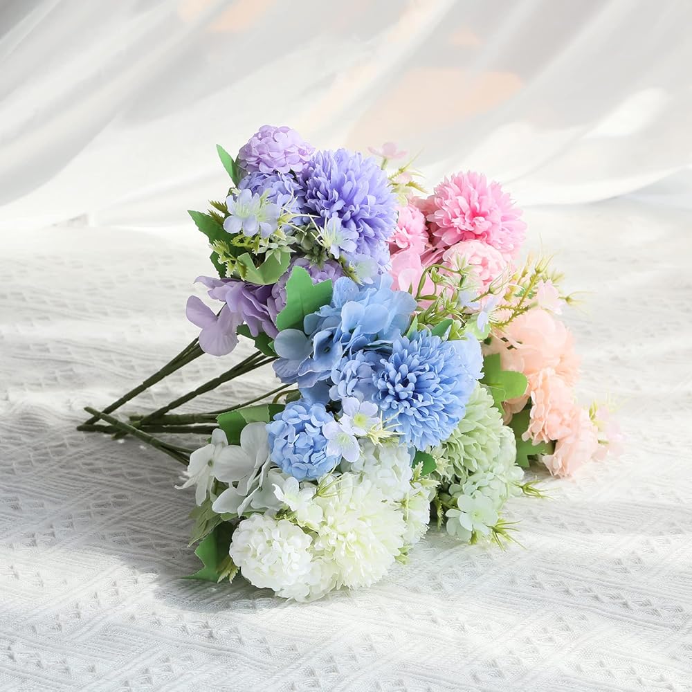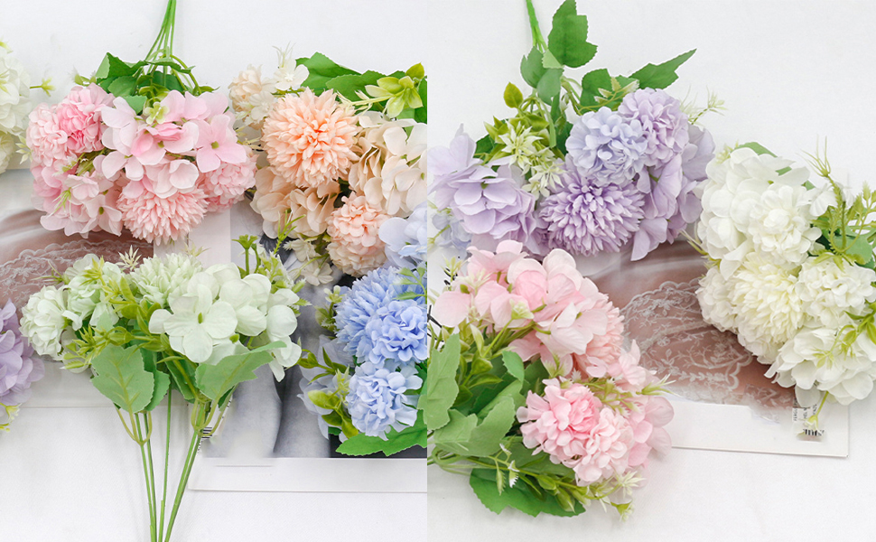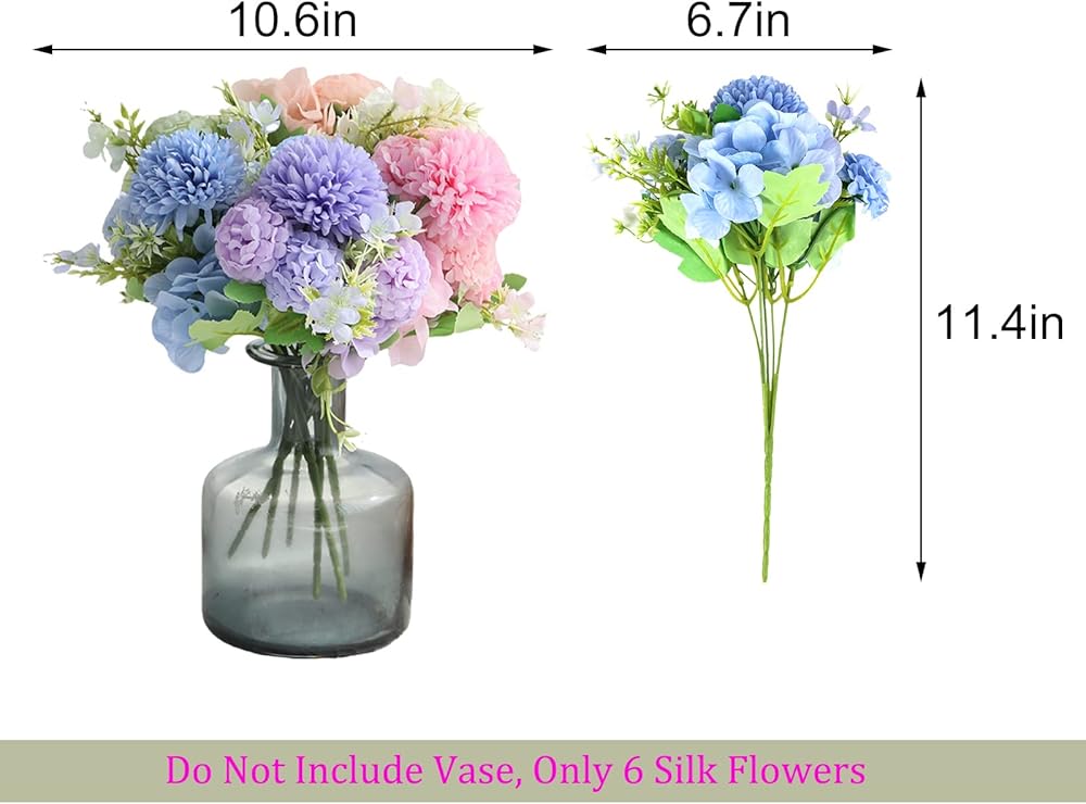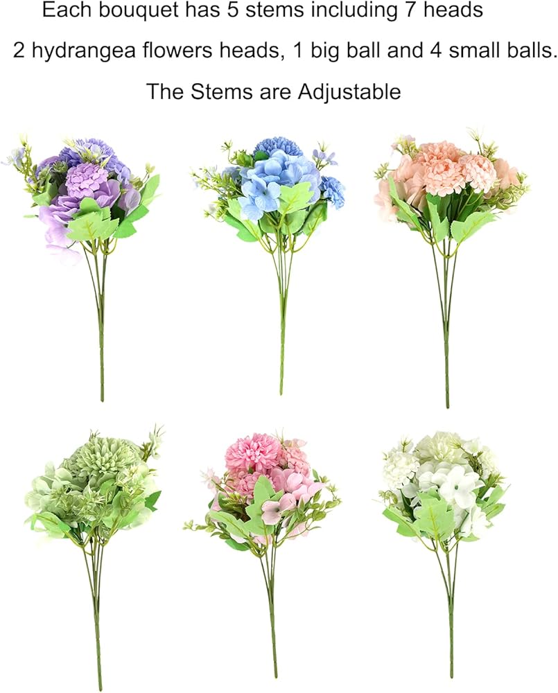 Quantity & Size - 6 bundles flowers for decoration including pink, blue, purple, green, white and champagne. Each flower bundle is 11.8in high and 8.26in wide. Every artificial floral bundle has 2 hydrangea flowers heads(diameter 3.9in), 1 big ball(diameter 2.56in) and 4 small balls(diameter 1.77in).