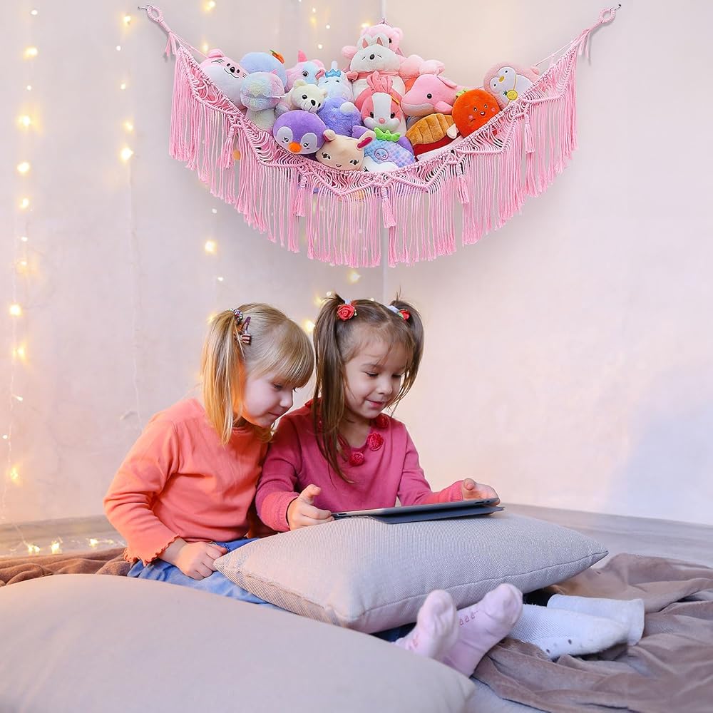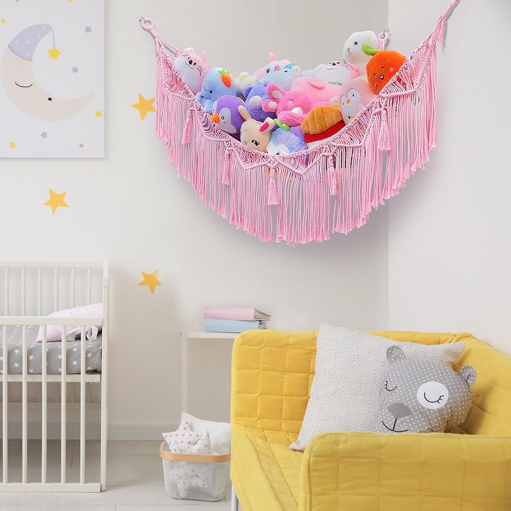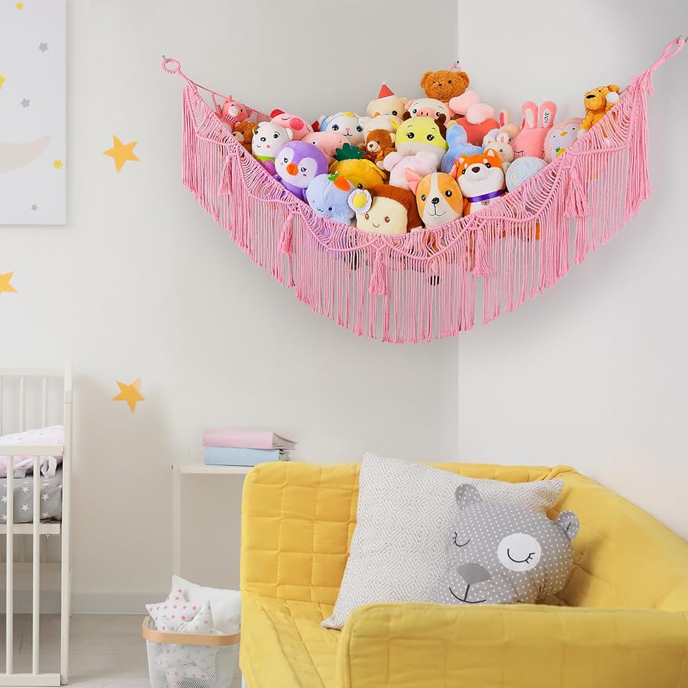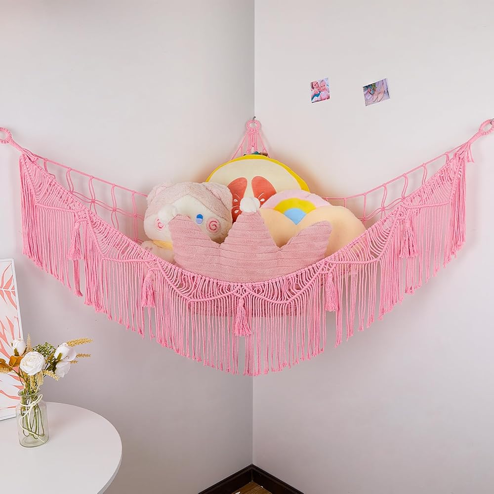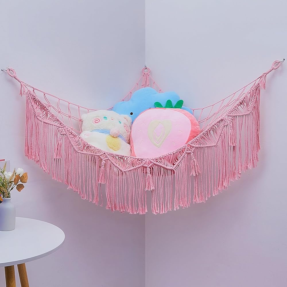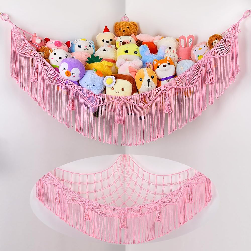 ديكور مثالي للغرفة: يمكن لتخزين الحيوانات المحشوة وضع الحيوانات المحشوة وألعاب الأطفال الأخرى، مثل الكرات والبطانيات والوسائد وما إلى ذلك، والحفاظ على غرف النوم وغرف اللعب مرتبة. علاوة على ذلك، تحتوي شبكة التخزين على شرابات منسوجة فريدة من نوعها، والتي يمكن استخدامها كديكور منزلي جميل. قم بتعليقها في زاوية الغرفة لإبقائها منظمة، وتحويل الألعاب الفوضوية إلى ديكورات.