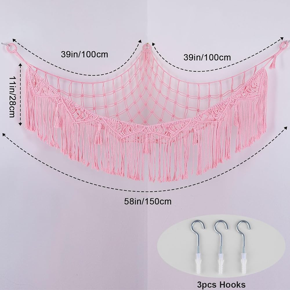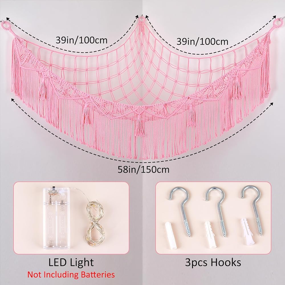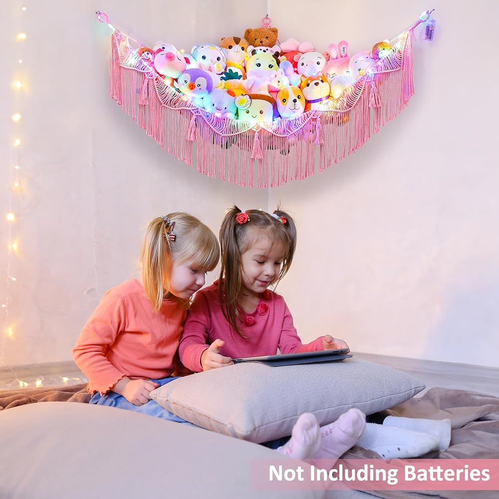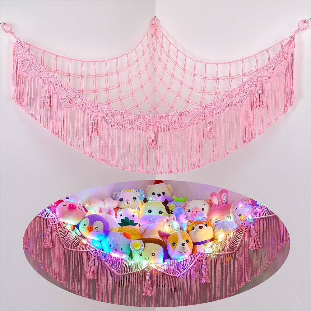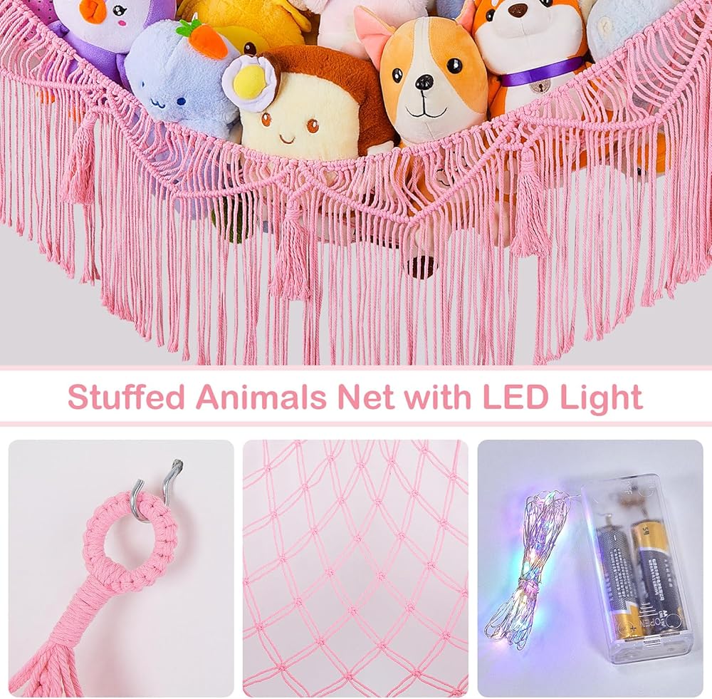 شبكة الحيوانات المحشوة مع شرابات: شبكة الحيوانات المحشوة أو الأرجوحة مصنوعة من مواد عالية الجودة، متينة للغاية ولا ترتخي. شبكة تخزين ألعاب منسوجة يدويًا بالكامل، تصميم شرابات فريد، تأتي مع سلسلة إضاءة LED لشعور دافئ حقًا (البطاريات غير متضمنة).