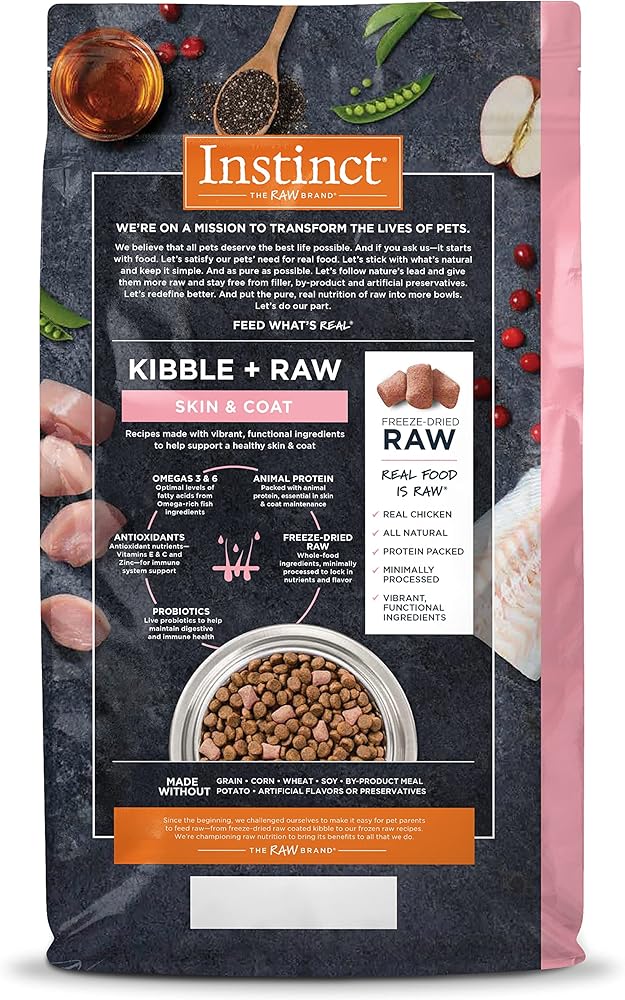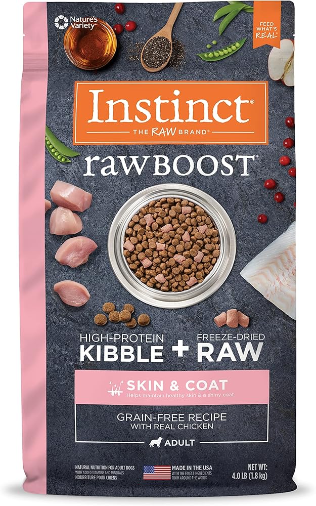 High protein, grain-free kibble plus freeze-dried raw, Instinct Raw Boost Grain-Free Recipe with Real Chicken for Skin & Coat Health is a better way to feed. Recipes made with vibrant, functional ingredients to help support skin & coat health. Unlock your dog's potential to thrive and put more of the pure, real nutrition of raw into every bowl.