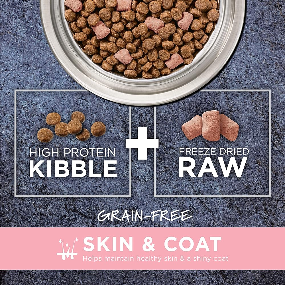 • SKIN AND COAT HEALTH DRY DOG FOOD + FREEZE DRIED RAW PIECES: Made with optimal levels of Omega 3 & 6 from menhaden fish meal and salmon oil, plus probiotics & antioxidants. Made without grain, potato, corn, wheat, soy, artificial colors or preservatives.
