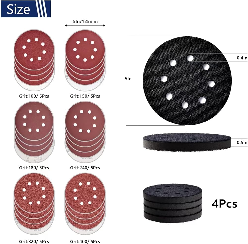 5 inch Dewal Random Orbital Sander Replacement Pad with 5 inch 8 Hole Hook Loop Foam & Sanding Backing Pads Sanding Discs Include 100/150/180/240/320/400 Grit