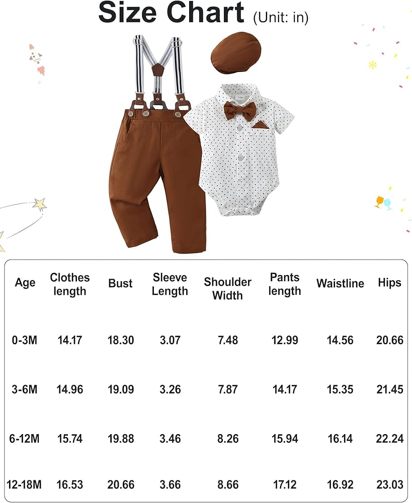 أربعة مقاسات: ملابس الأولاد من عمر 0 إلى 3 أشهر، بدلة للأولاد الرضع من 3 إلى 6 أشهر، ملابس للأولاد الصغار بعمر 6-12 شهرًا، ملابس للأولاد بعمر 12-18 شهرًا. ملابس الأولاد الرضع هذه مطابقة للمقاس، راجع جدول المقاسات للاختيار من فضلك.