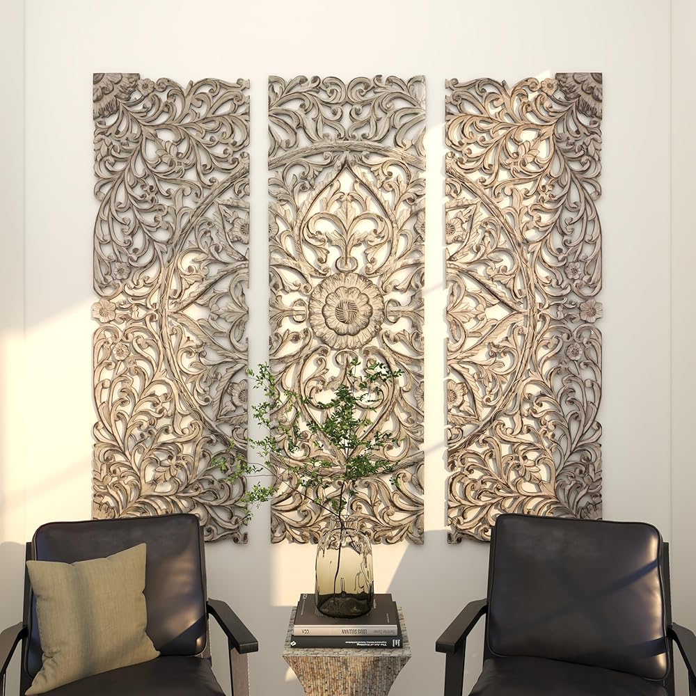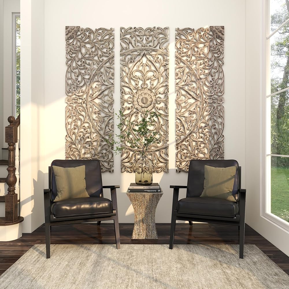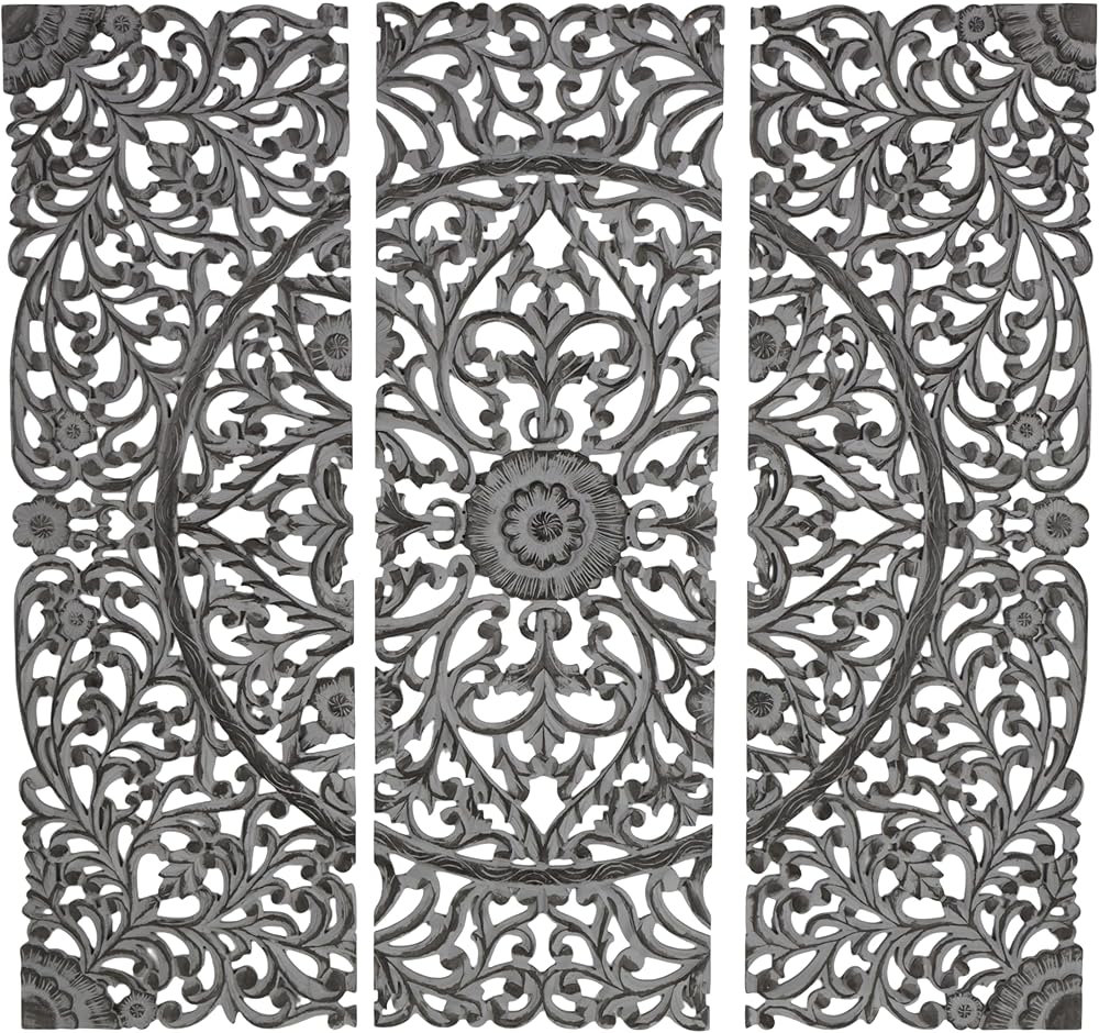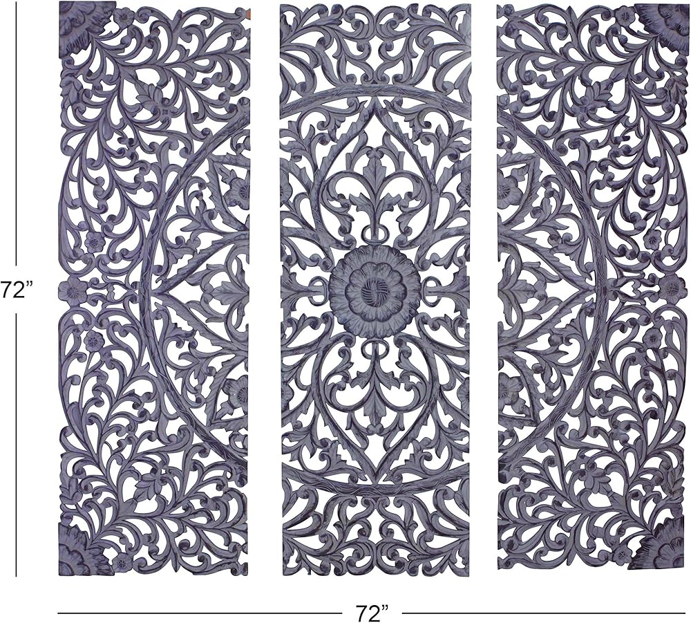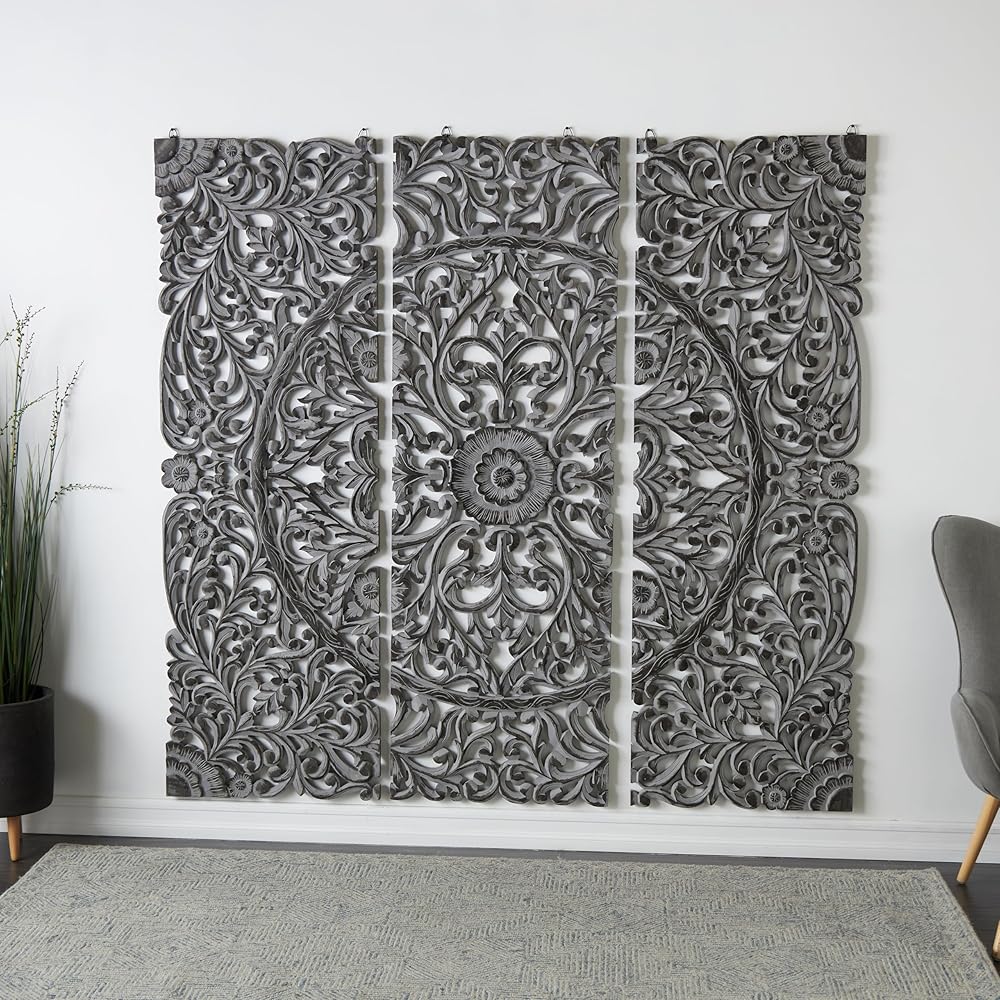 FEATURES RECTANGLE WALL DECOR: Intricate, ornate hand-carved flowers and acanthus designs throughout the blooming flower encompassed by a circle in the center when the three panels are hung next to each other