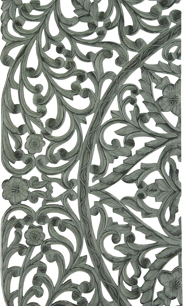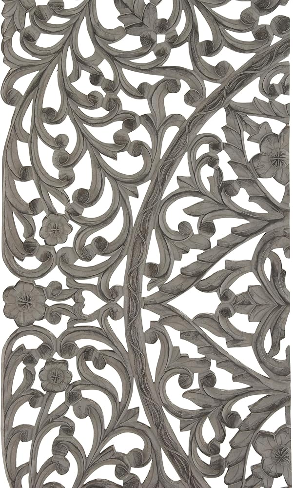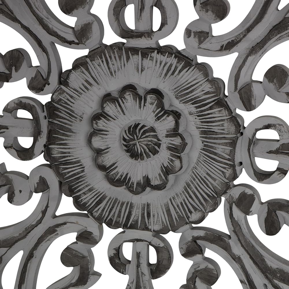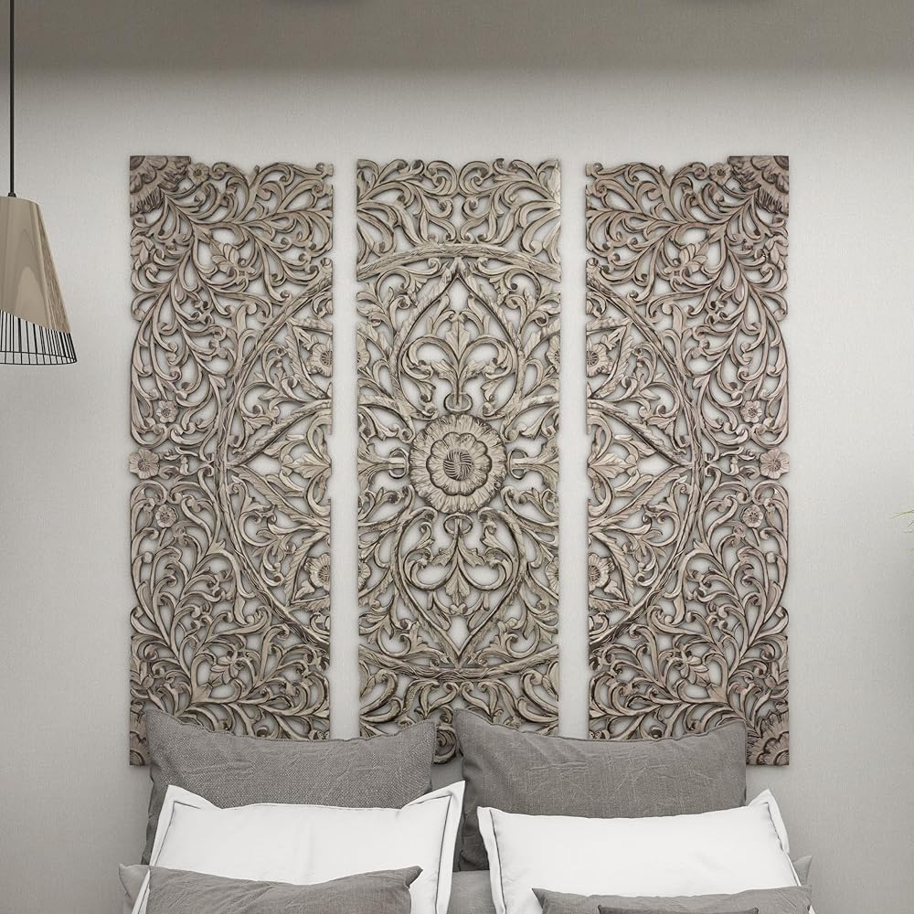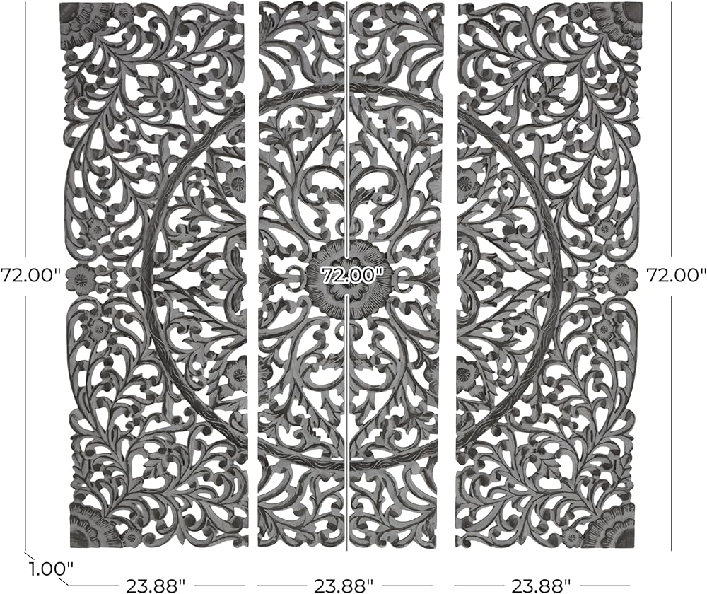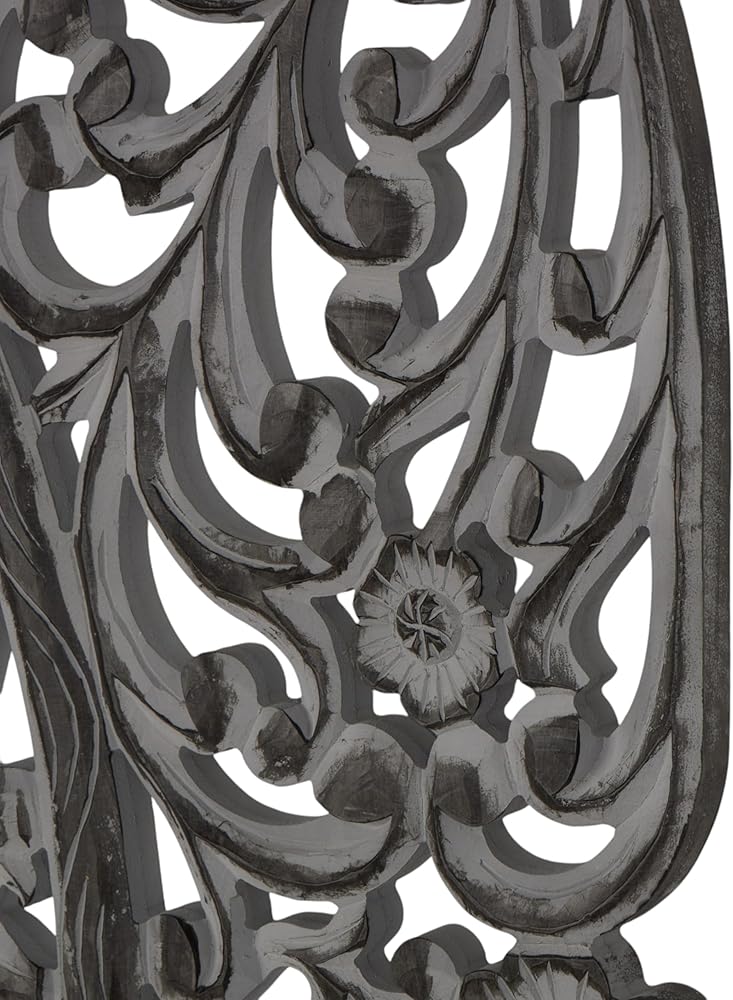 FEATURES RECTANGLE WALL DECOR: Intricate, ornate hand-carved flowers and acanthus designs throughout the blooming flower encompassed by a circle in the center when the three panels are hung next to each other