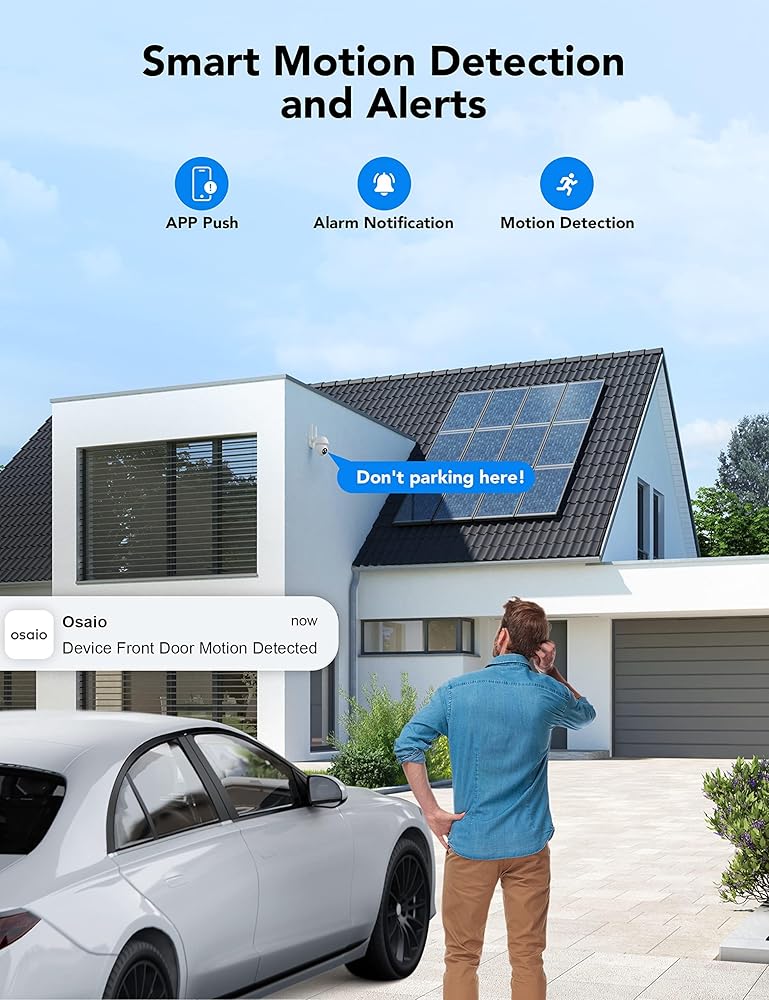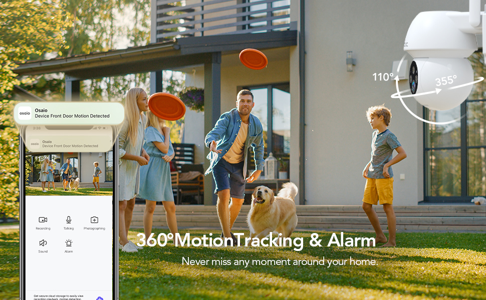 🏃♂️🚨 [تتبع الحركة والتنبيهات بزاوية 360 درجة] - تتميز كاميرا الأمان الخارجية لدينا بدوران عمودي بزاوية 110 درجة وأفقي بزاوية 355 درجة، مما يضمن عدم تفويت أي شيء أبدًا. كما أنها تتميز بكشف متقدم للحركة مع تنبيهات في الوقت الفعلي عبر تطبيق Osaio على هاتفك الذكي.