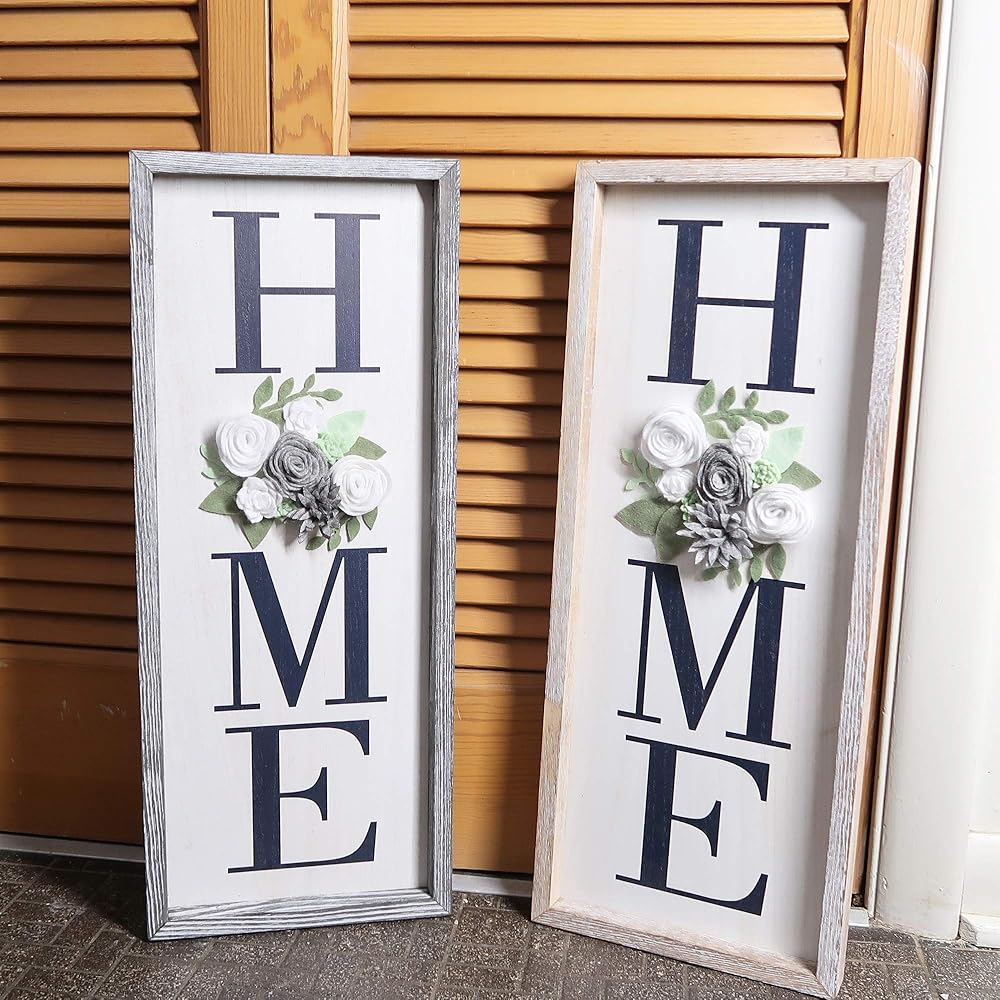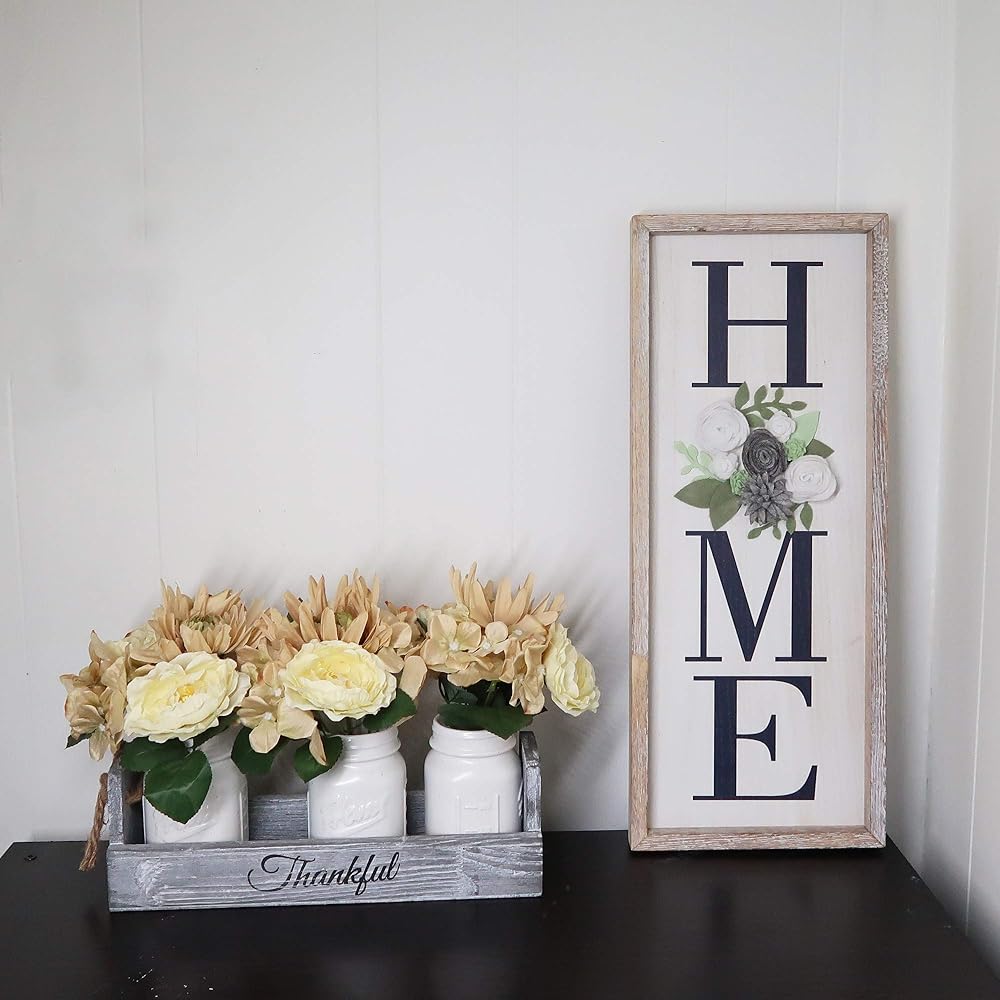 Rustic Grey Vertical Wooden HOME Signs for Home Decor with Felt Flower