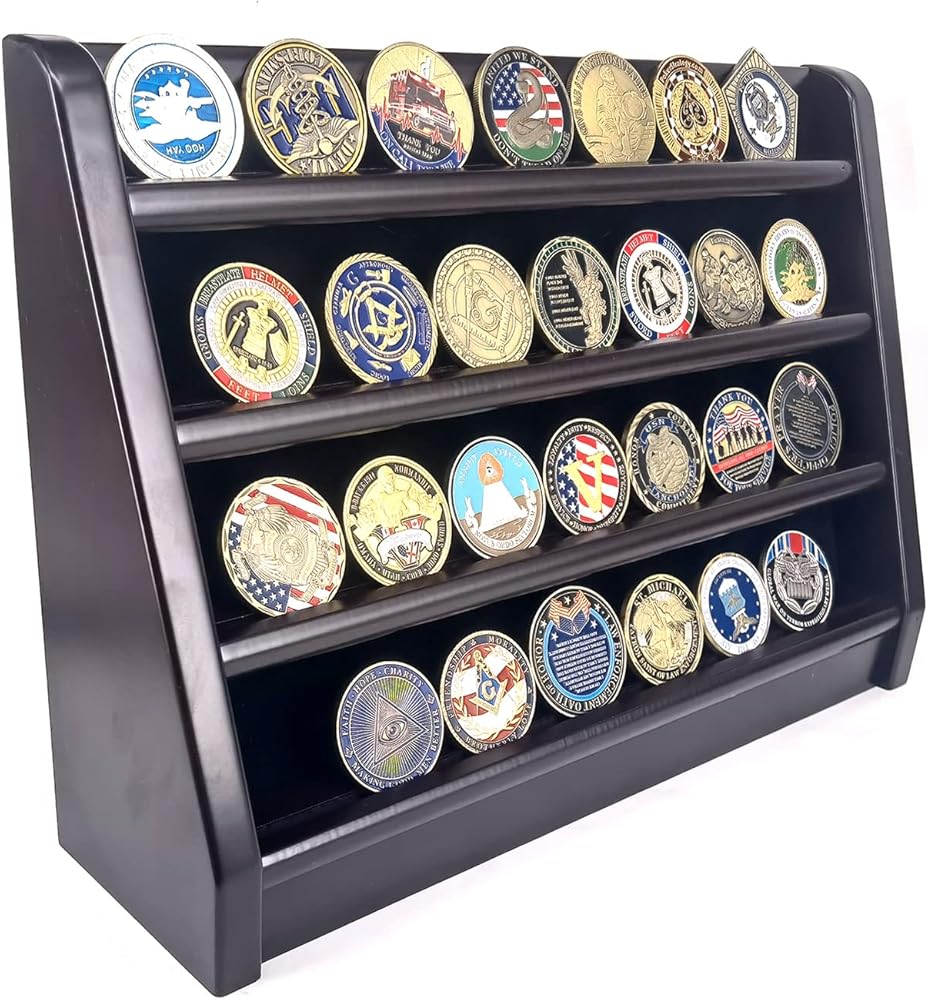 رف عملات معدنية من 4 صفوف، يمكنه عرض ما يصل إلى 32 - 38 قطعة من عملات التحدي حسب أحجام عملاتك.