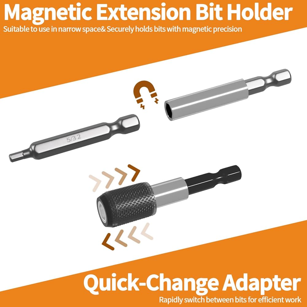 【تشغيل مريح】 تتضمن مجموعة الأدوات قضيب تمديد ومحول سريع التغيير، مما يجعل عملك أكثر سهولة وكفاءة. لا مزيد من المتاعب مع تغيير الرؤوس؛ يمكنك إكمال المهام بسرعة.