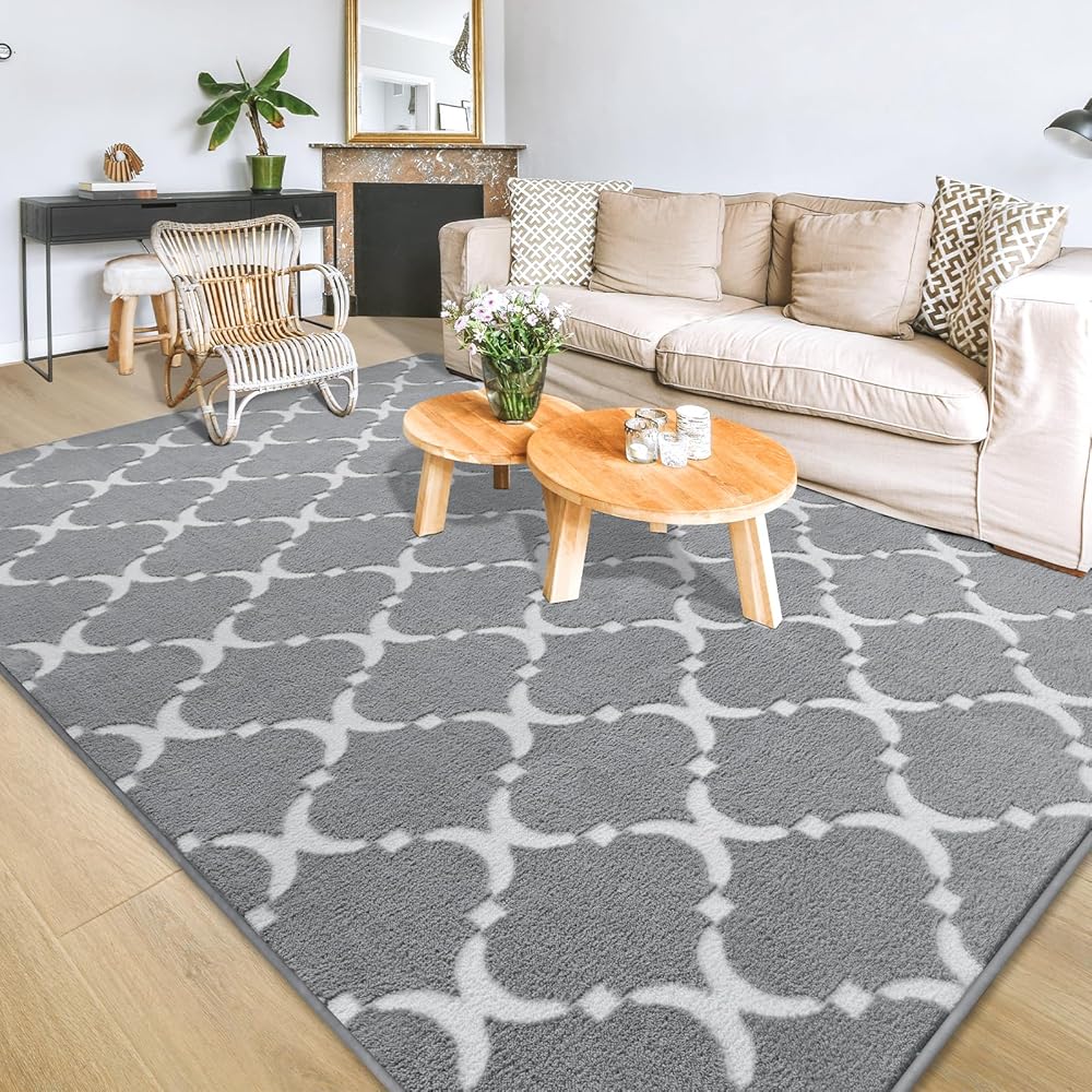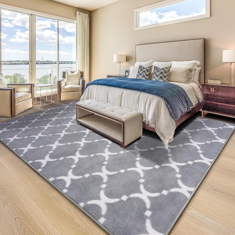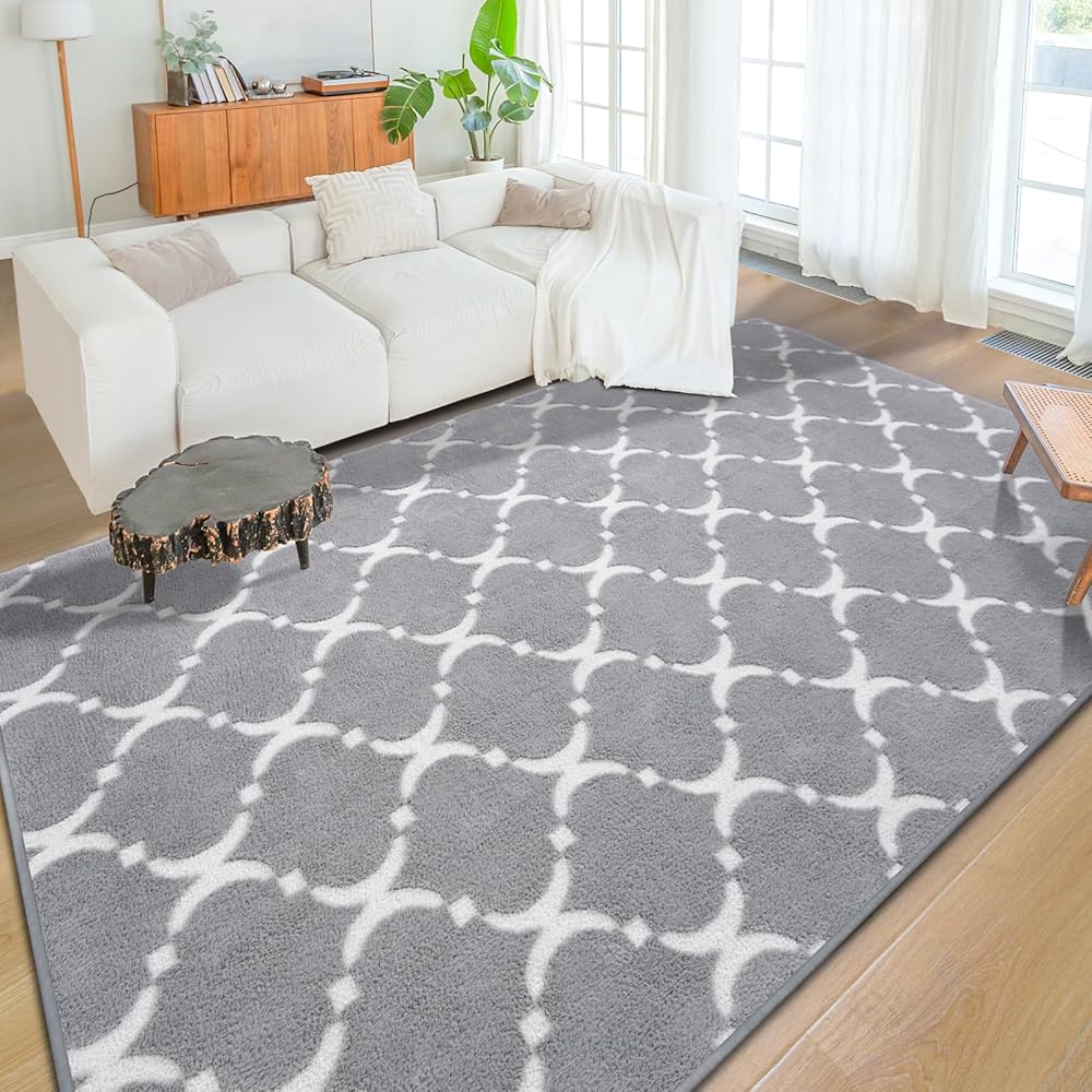 تصميم أنيق فريد: تم تصميم هذه السجادة الأشعث ذات التصميم الهندسي الحديث مع كومة قطيفة رمادية ونمط فانوس قطيفة أبيض بنمط متناسق وعقلاني وهندسي يضيف إحساسًا بالأناقة والرقي إلى غرفتك ويجعل منزلك مميزًا