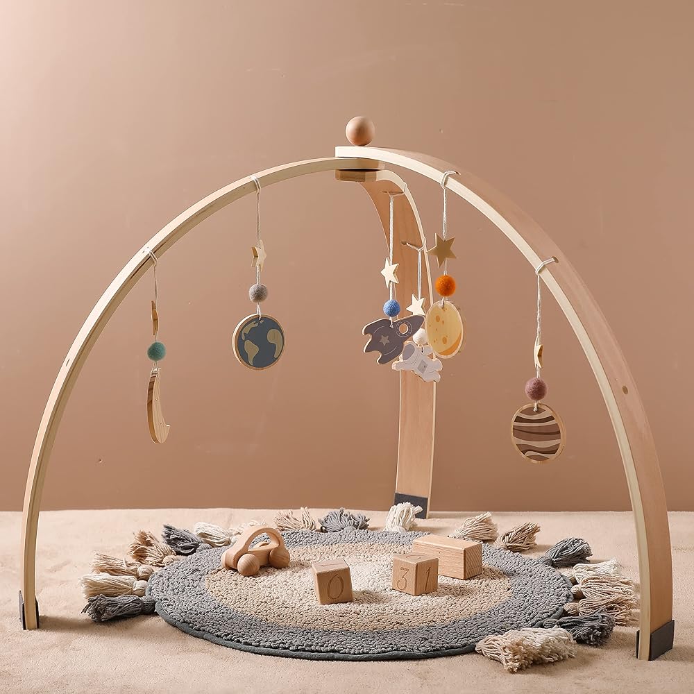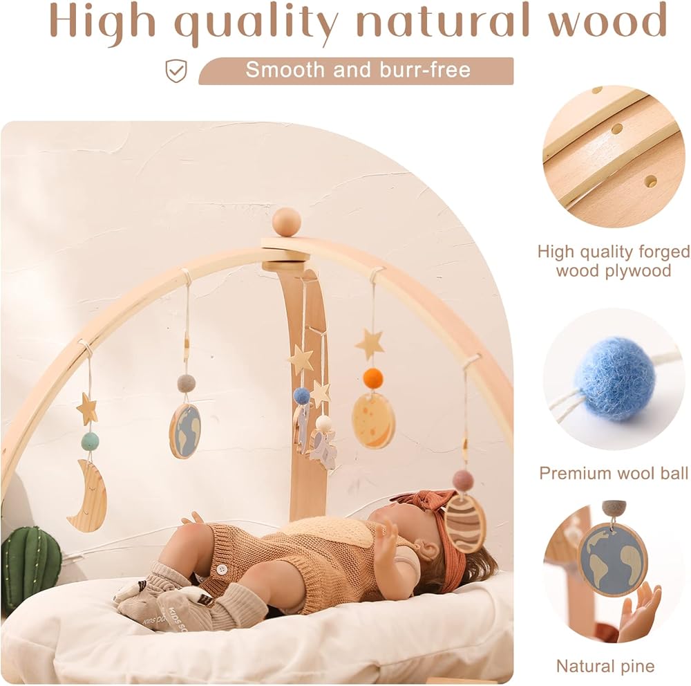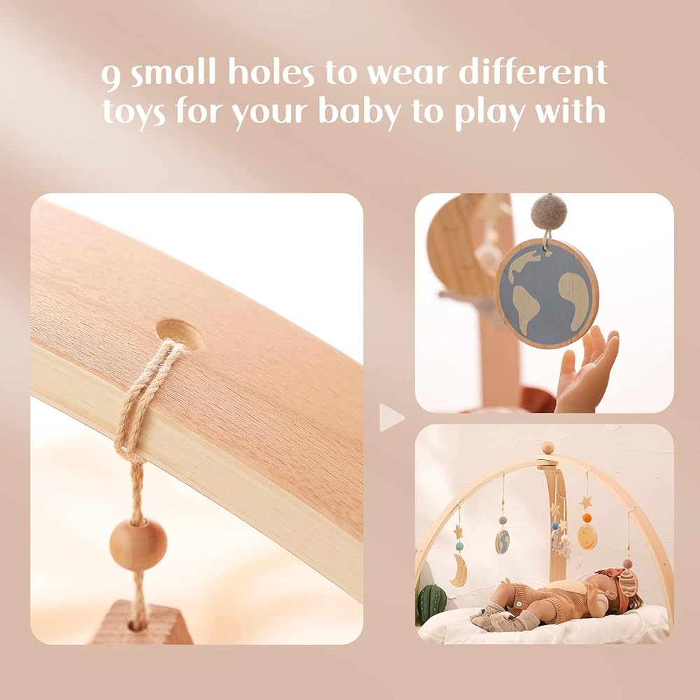 Ikubigu خشبية الطفل الصالة الرياضية طوي الطفل لعب الصالة الرياضية الإطار مركز الأنشطة شنقا بار مع 6 ألعاب للاستكشاف الحسي وتنمية المهارات الحركية، هدية الوليد للفتيات الأولاد (بدون حصيرة اللعب)