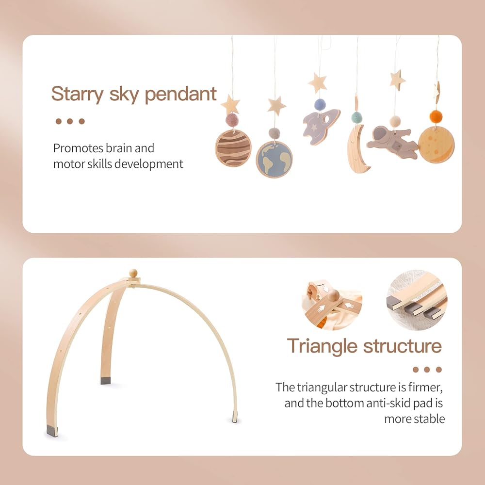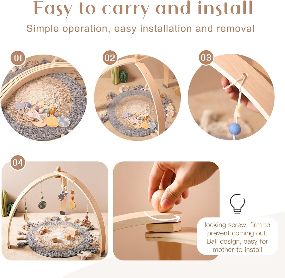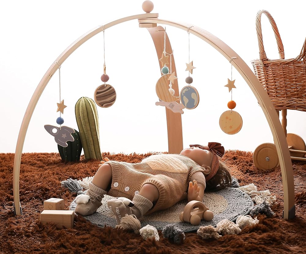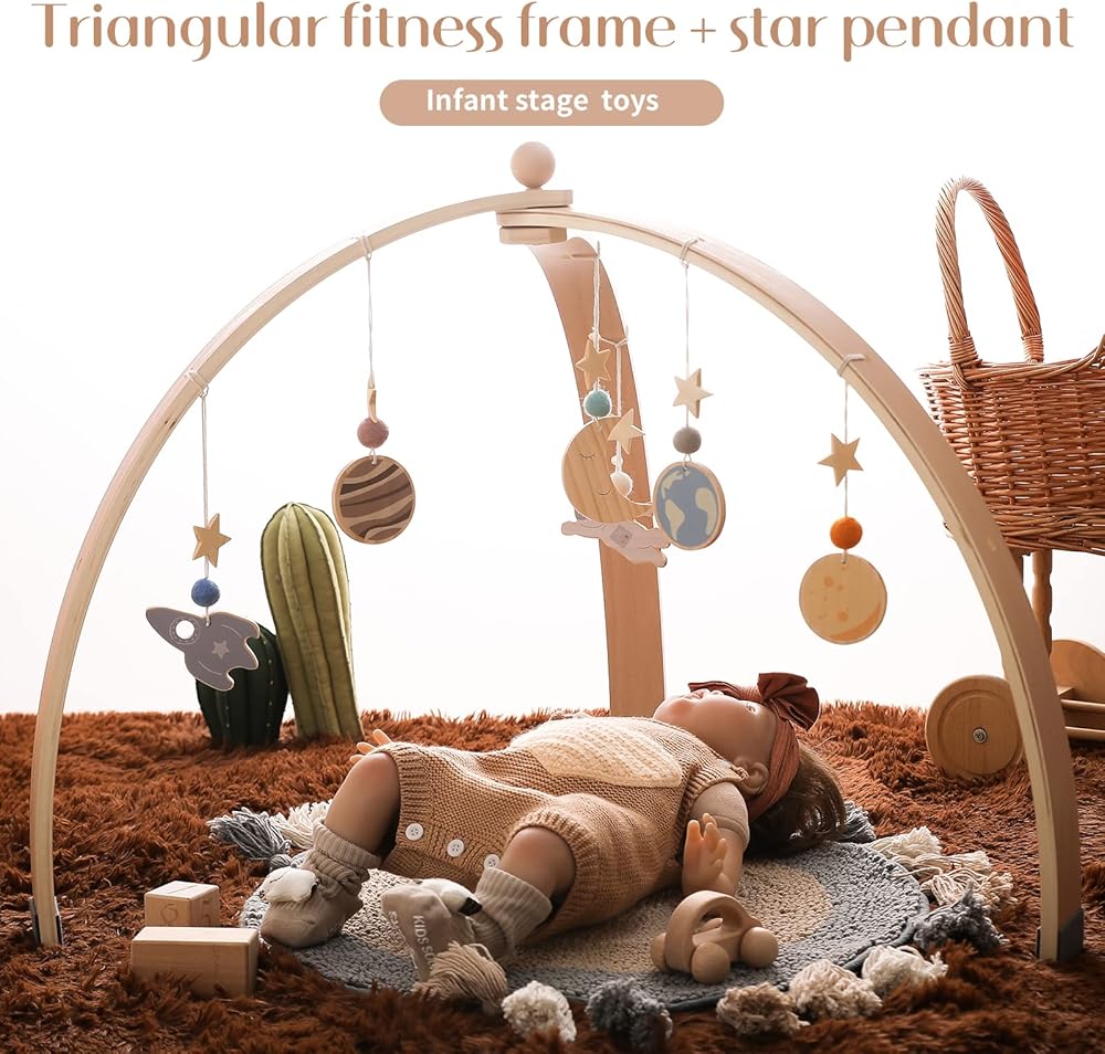 Ikubigu خشبية الطفل الصالة الرياضية طوي الطفل لعب الصالة الرياضية الإطار مركز الأنشطة شنقا بار مع 6 ألعاب للاستكشاف الحسي وتنمية المهارات الحركية، هدية الوليد للفتيات الأولاد (بدون حصيرة اللعب)