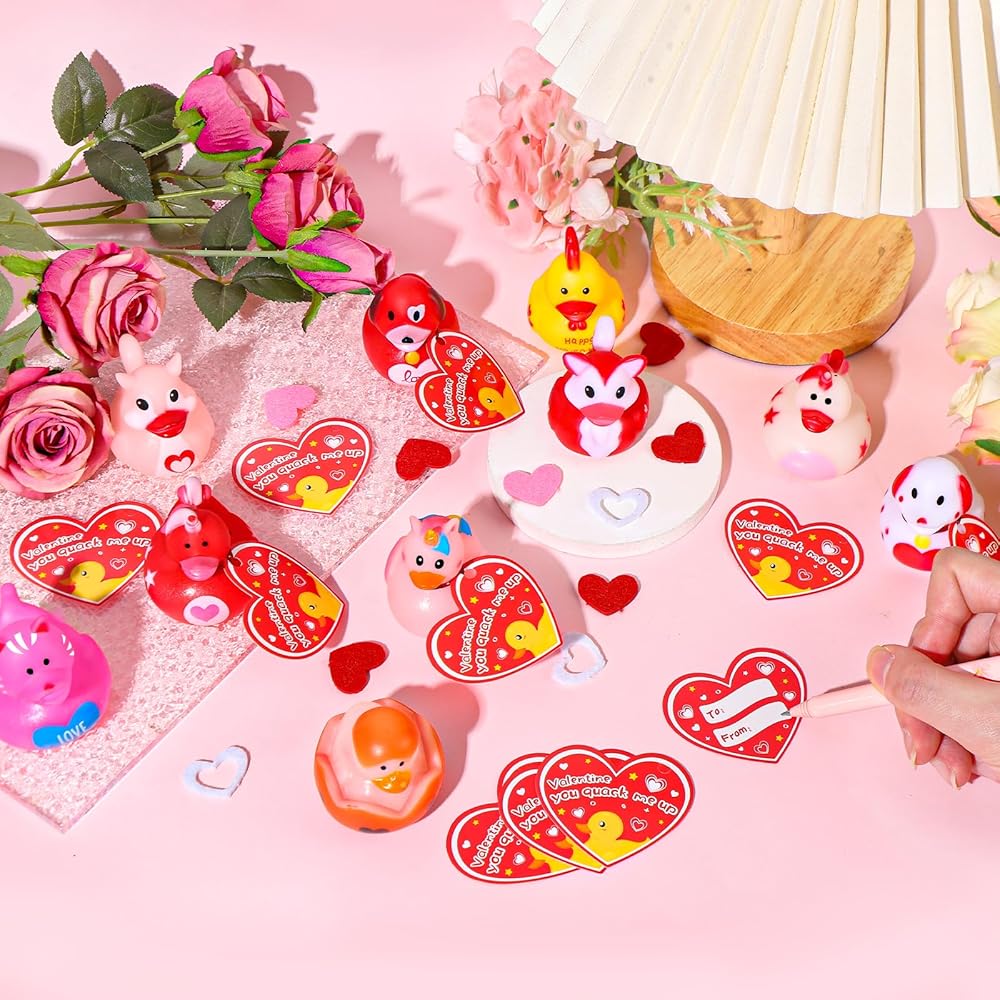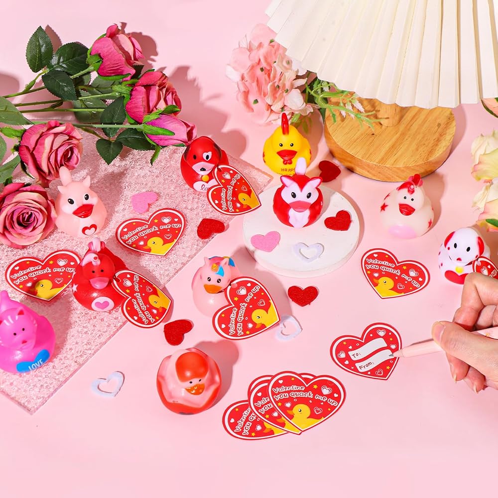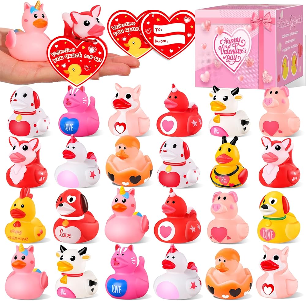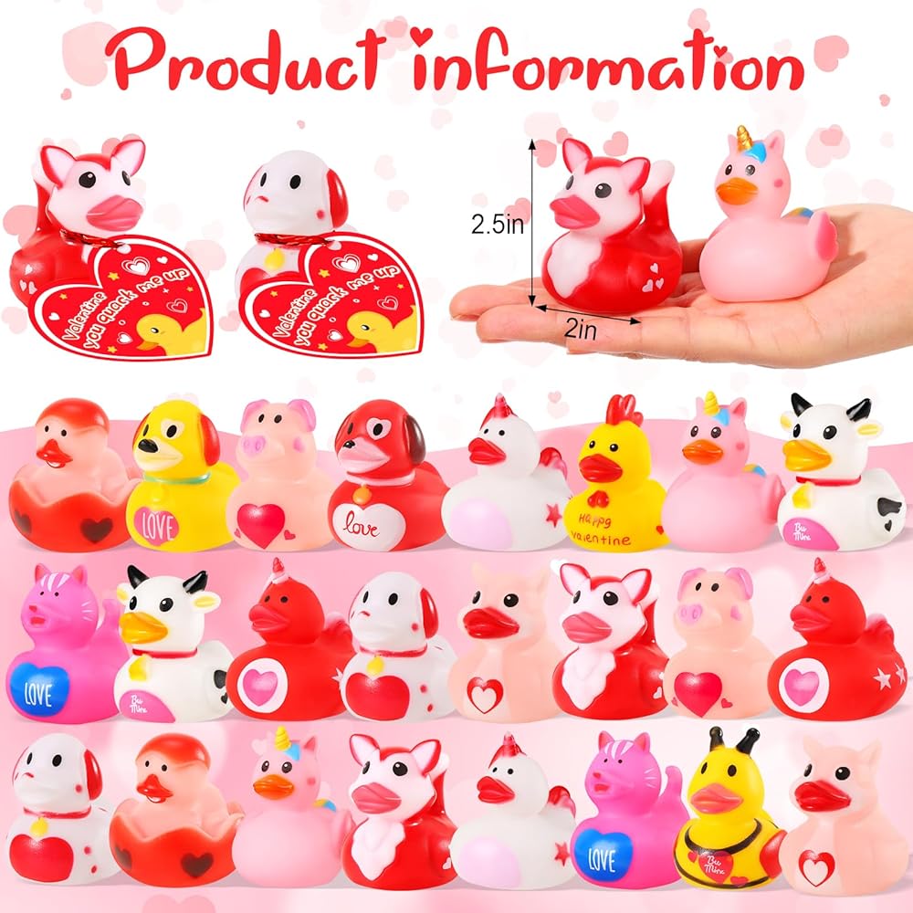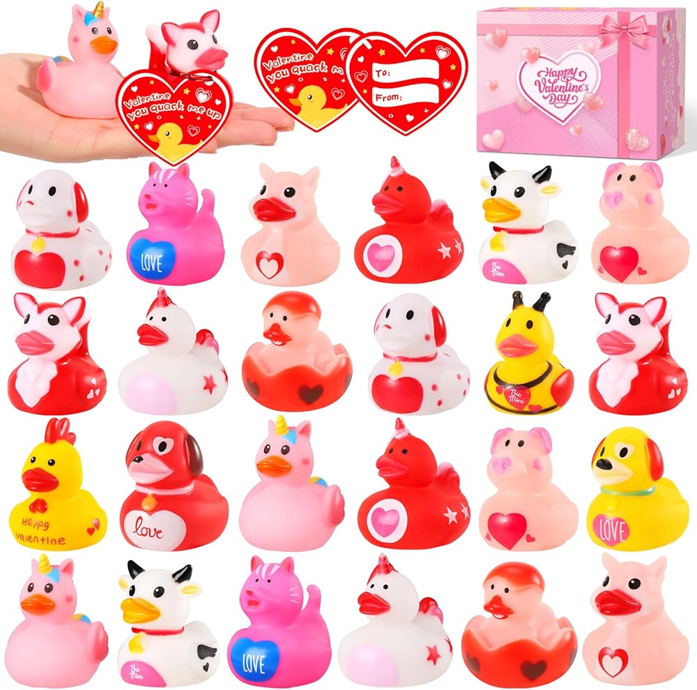ANGGIKO 24 حزمة من البط المطاطي لعيد الحب مع بطاقات الهدايا، ألعاب حوض استحمام مطاطية على شكل قلب لعيد الحب، بطات جيب للأطفال، هدايا مكافآت تزيين حفلات عيد الحب للأولاد والبنات