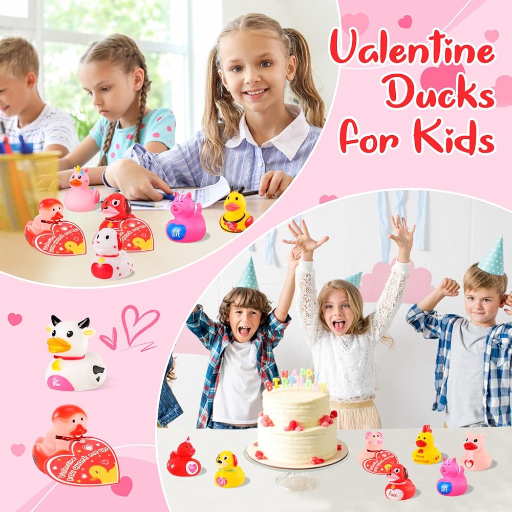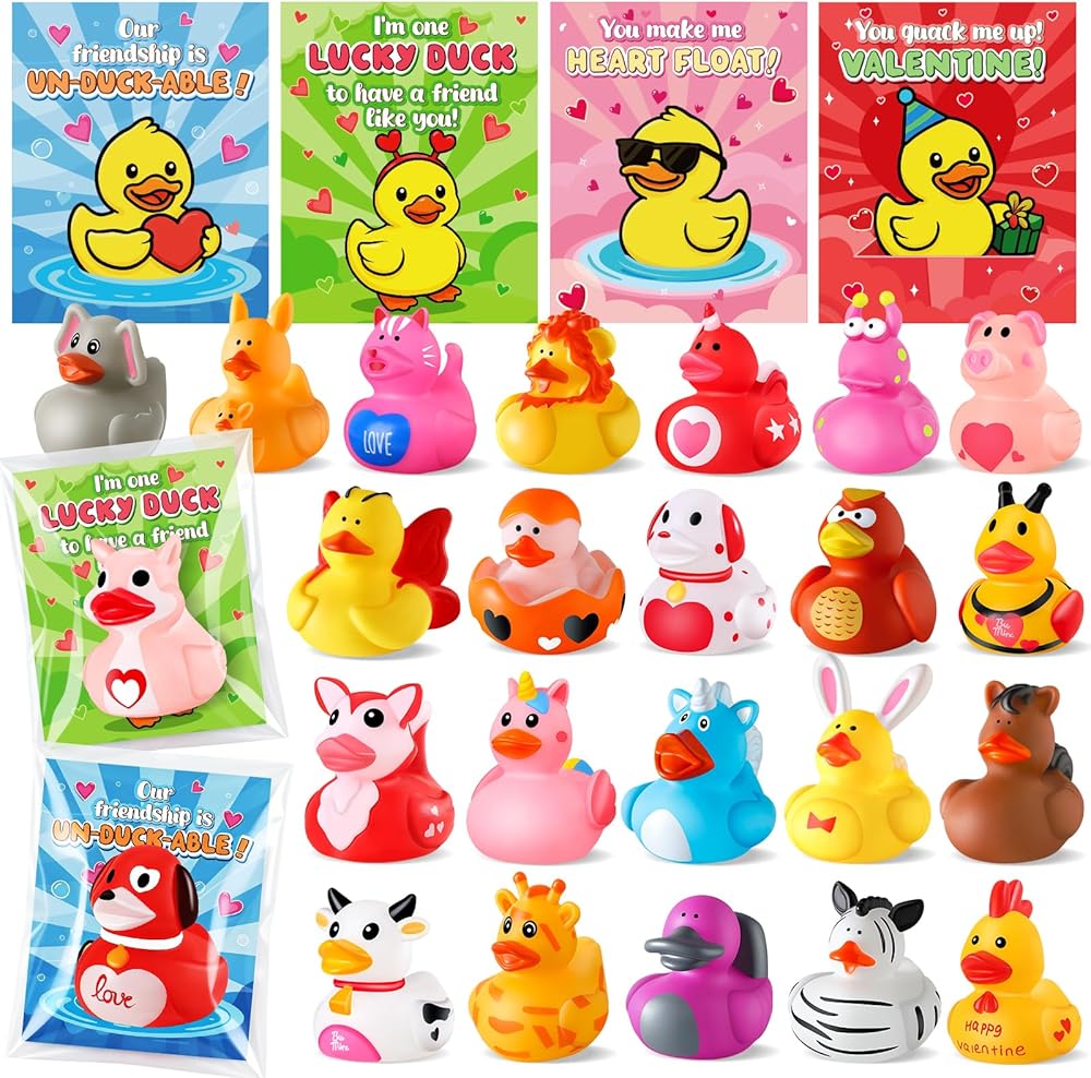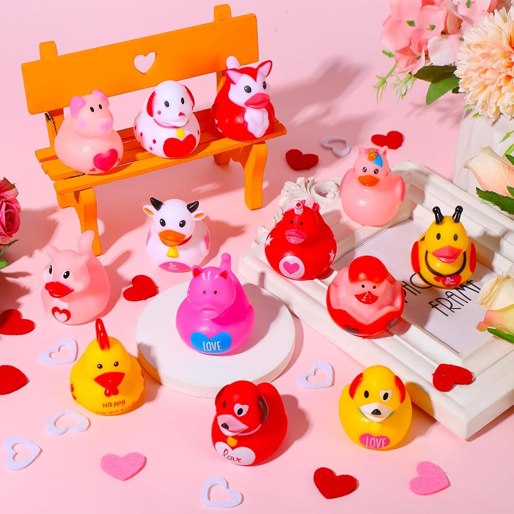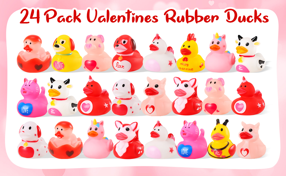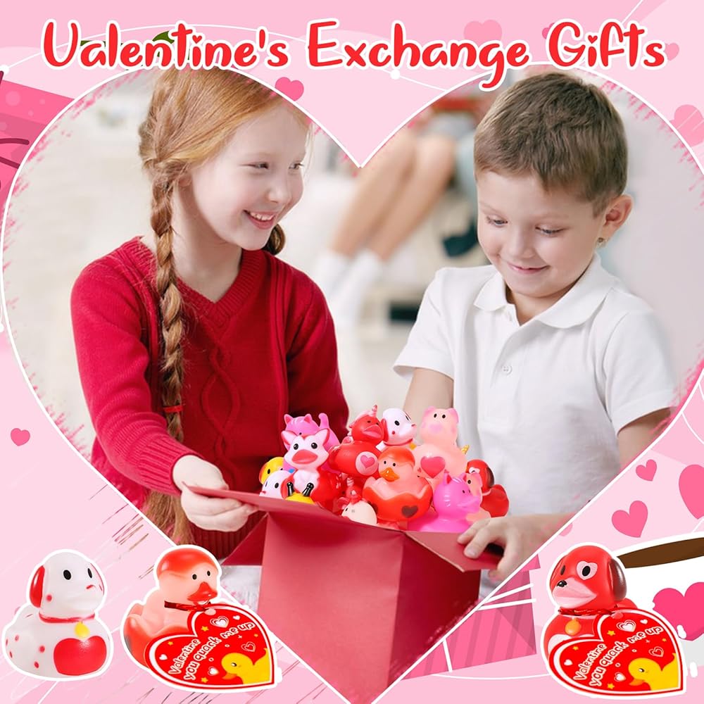 ANGGIKO 24 حزمة من البط المطاطي لعيد الحب مع بطاقات الهدايا، ألعاب حوض استحمام مطاطية على شكل قلب لعيد الحب، بطات جيب للأطفال، هدايا مكافآت تزيين حفلات عيد الحب للأولاد والبنات