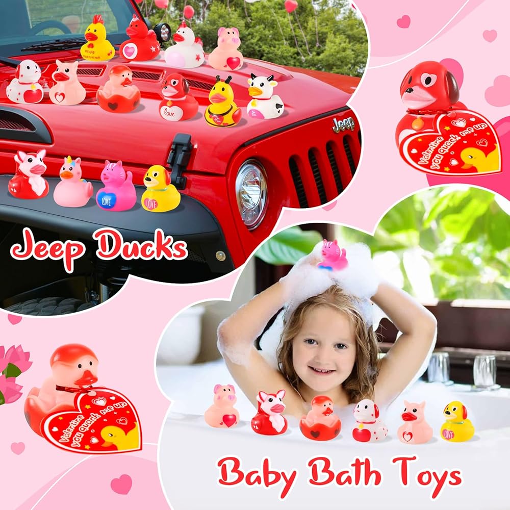 【متعة لا نهاية لها】ستكون هذه ألعاب بطة رائعة للعبة "JEEP DUCK"، ومشاركة السعادة والنية الطيبة. رائعة لخيارات الهدايا للأطفال، وحشو حقائب عيد الحب، ومستلزمات الحفلات. مثالية للمرح في حمام السباحة أو حوض الاستحمام. استخدمها لتزيين الكعك أو سلة الهدايا، أو عرضها في وعاء خلال يوم عيد الحب، كجزء من إكليل عيد الحب، أو إضافة شريط وبطاقة، ستكون جاهزًا لعيد الحب.