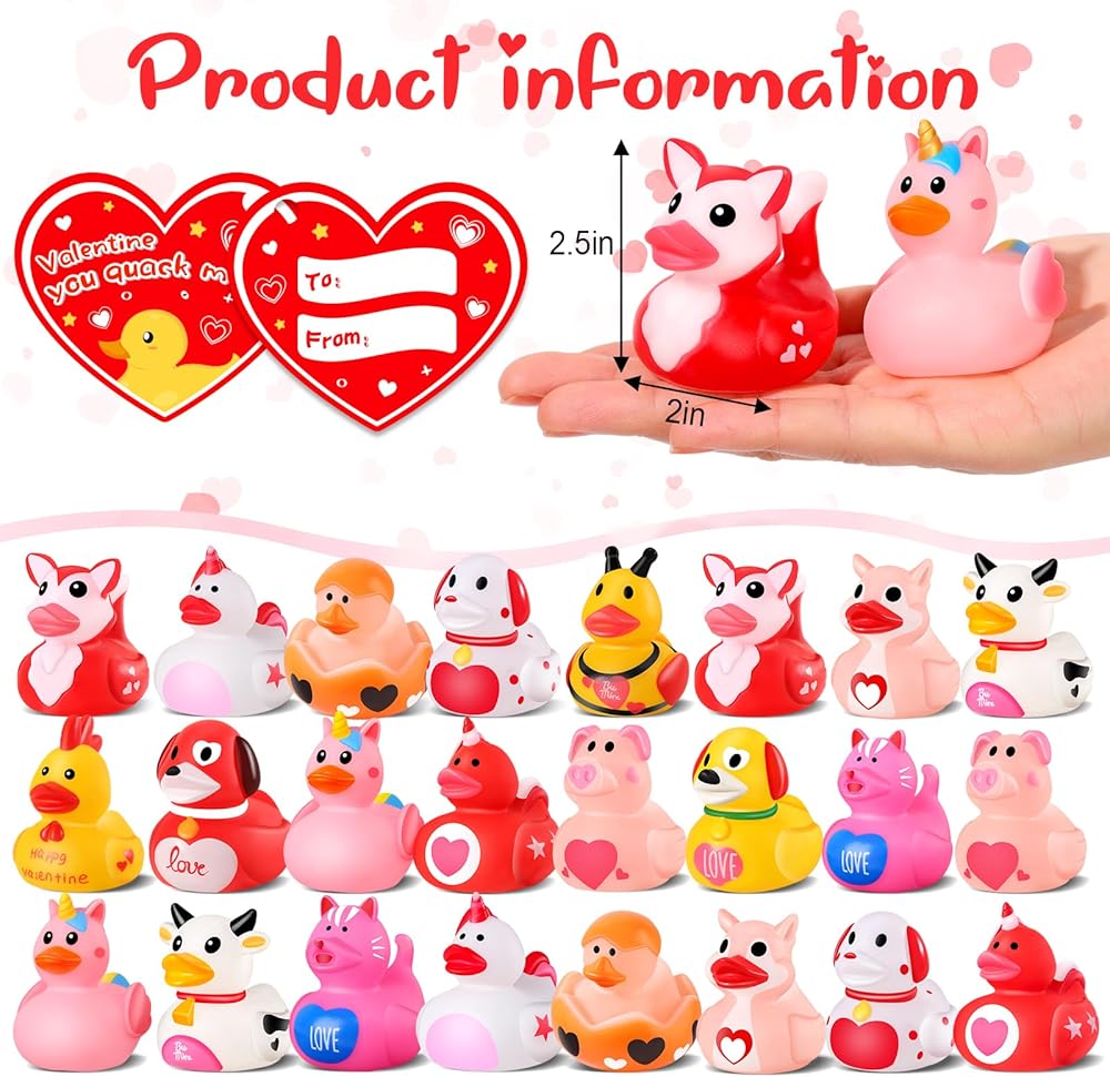 【قيمة ممتازة】مع مجموعة مكونة من 24 بطة بسعر في متناول الجميع، فإن البط المطاطي الخاص بنا في عيد الحب هو قيمة ممتازة. بالإضافة إلى البطات الـ 24، ستحصل أيضًا على 24 بطاقة رائعة وصندوق هدايا مصمم خصيصًا لعيد الحب. إنها طريقة رائعة لإضافة لمسة من المرح والإثارة إلى أي احتفال بعيد الحب.