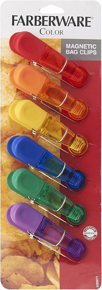 This Farberware Classic Set of 15 Translucent Magnetic Bag Clips makes it easy to close bags of chips, flour, sugar, or bread to keep them fresh after they've been opened. Made of durable plastic in vibrant translucent colors with thumb grips for easy use, the clips are magnetic, so they can be used to hang notes, grocery lists, photos, or other paper items on the fridge. Includes 15 clips. Hand-wash in warm, soapy water then rinse and dry.