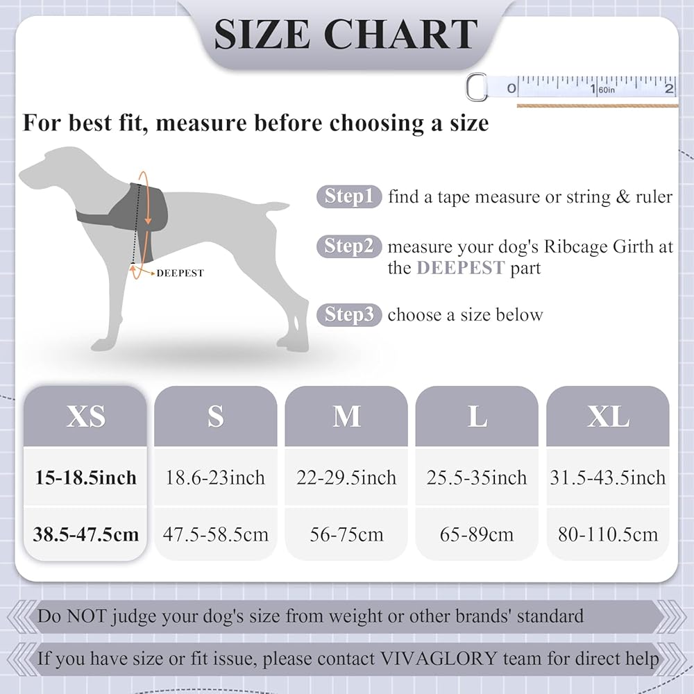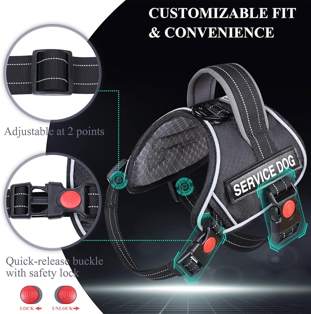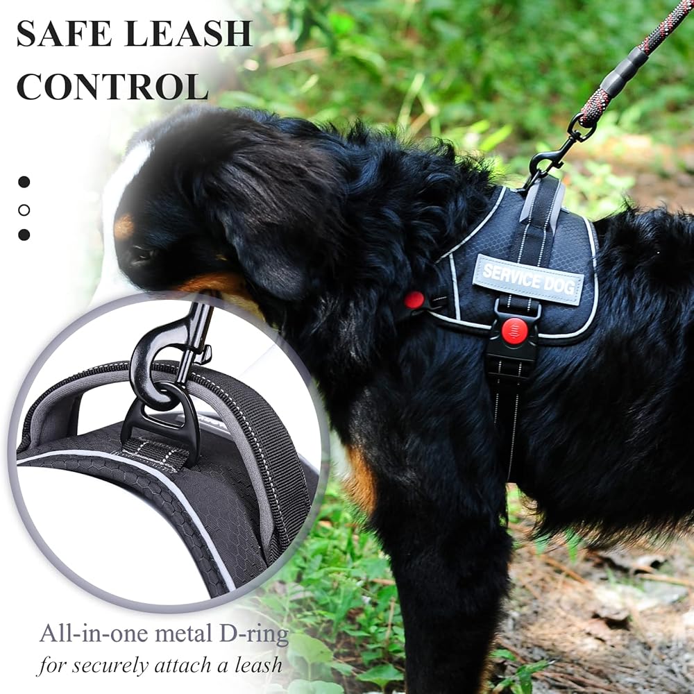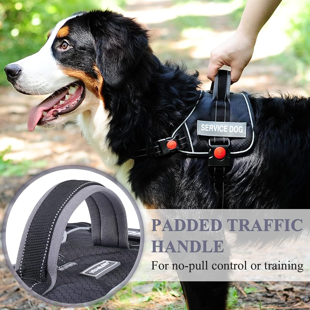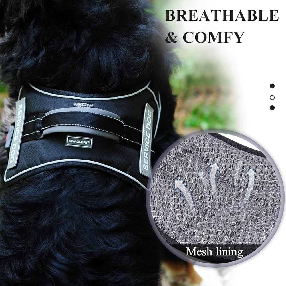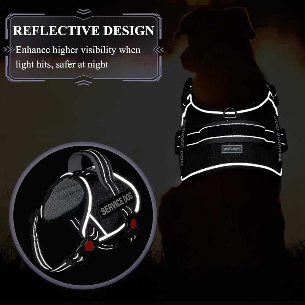 VIVAGLORY خدمة الكلب سترة، لا سحب تسخير سلامة الكلب مع مقبض مبطن ومشبك المقود، سترة الحيوانات الأليفة عاكسة للتنفس مع بقع قابلة للإزالة، قابل للتعديل لتناسب جرو في التدريب، أسود