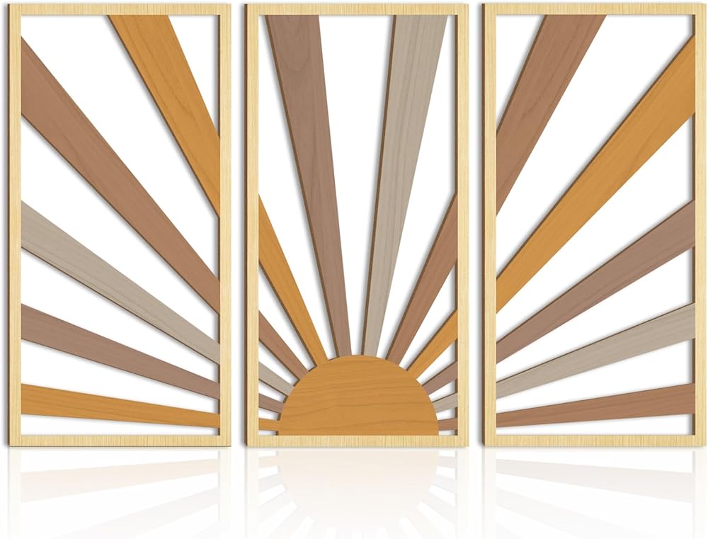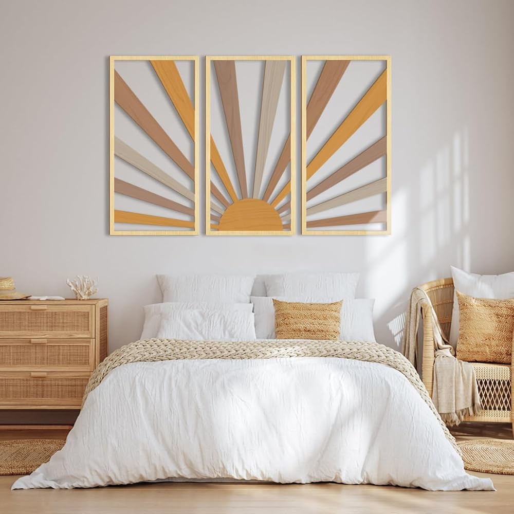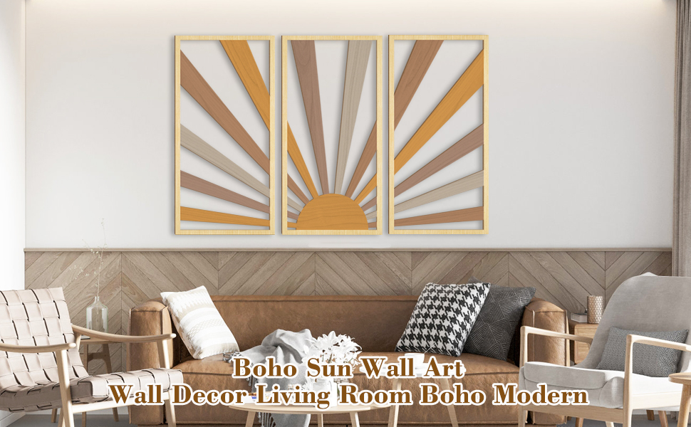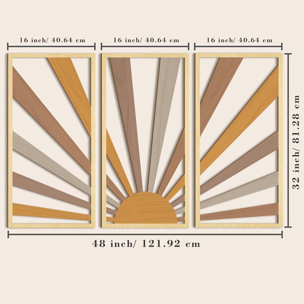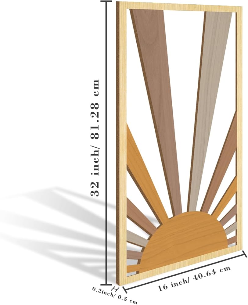 【لوحة فنية جدارية كبيرة من خشب الشمس بنمط بوهيمي】تتضمن 3 قطع فنية جدارية شمسية لغرفة المعيشة، كل لوحة بمقاس 16 انش × 32 انش. يضيف تصميم الشمس المشرقة وخطوط أشعة الشمس البسيطة والممتدة زخرفة إلى منزلك، مما يمنح أي مساحة شعورًا دافئًا ومرحبًا به ويبشر بالأمل في صباحك.