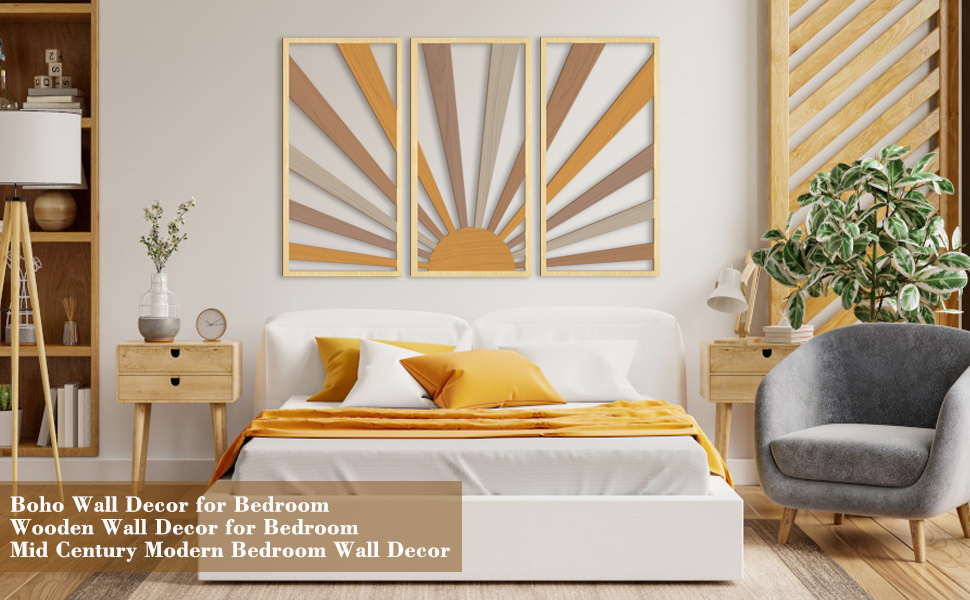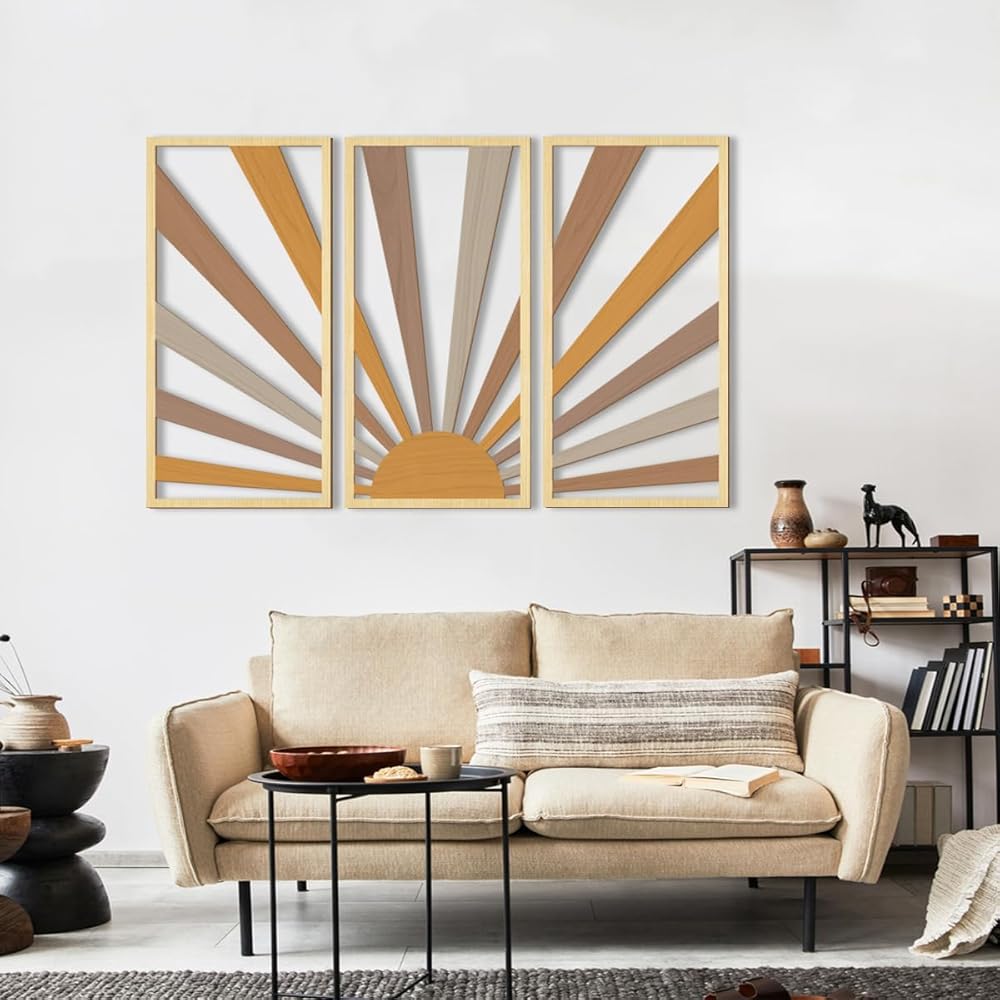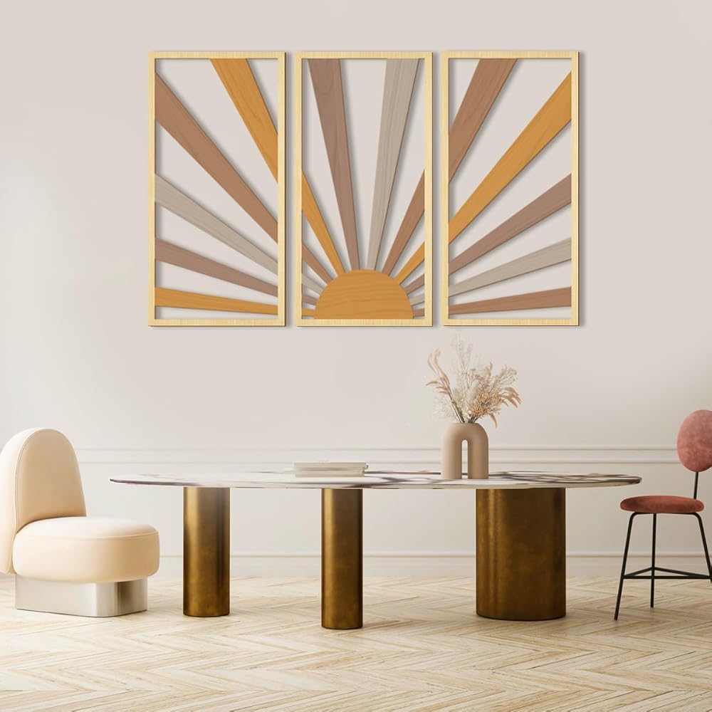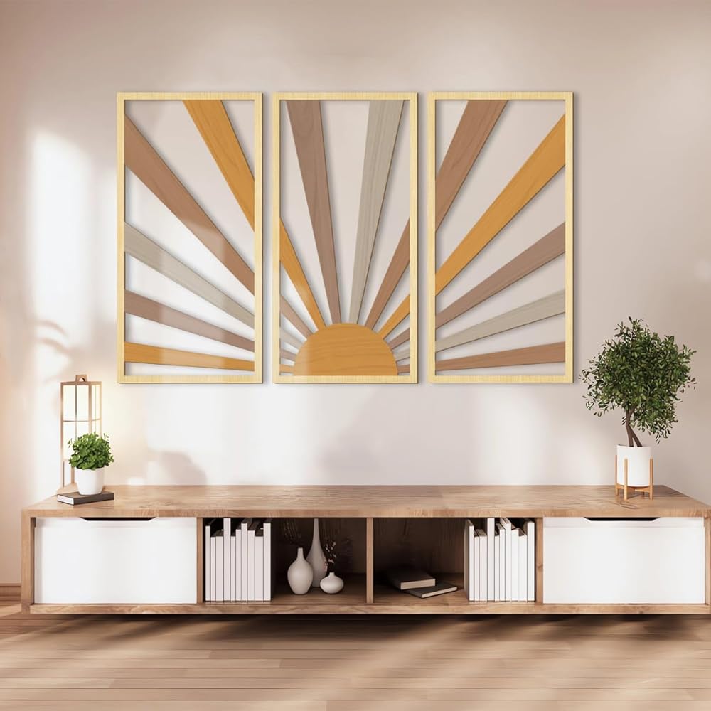 【لوحة فنية جدارية كبيرة من خشب الشمس بنمط بوهيمي】تتضمن 3 قطع فنية جدارية شمسية لغرفة المعيشة، كل لوحة بمقاس 16 انش × 32 انش. يضيف تصميم الشمس المشرقة وخطوط أشعة الشمس البسيطة والممتدة زخرفة إلى منزلك، مما يمنح أي مساحة شعورًا دافئًا ومرحبًا به ويبشر بالأمل في صباحك.