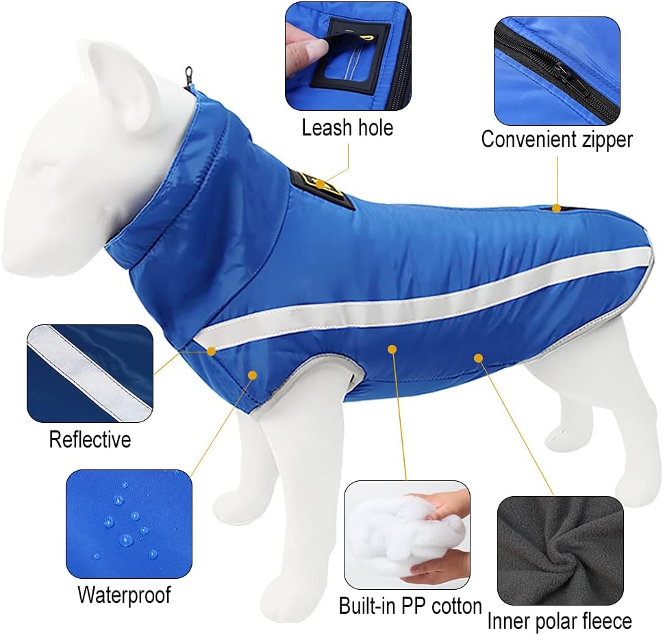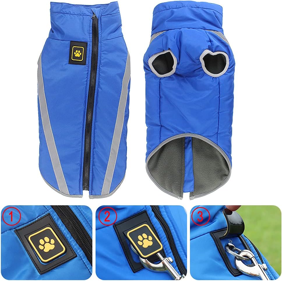 REFLECTIVE: Dog winter coat sewn with reflective strips, keep your dog safe when walking at night. Hidden leash hole on top allows you to attach the leash to the collar when the dog is wearing the coat.