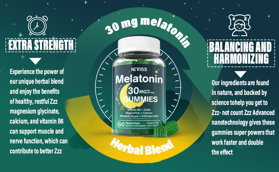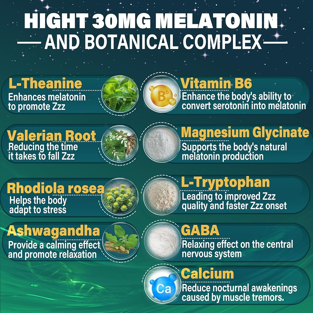 القوة القصوى: جربت 10 ملغ و15 ملغ و20 ملغ من الميلاتونين ولا يوجد أي تأثير حتى الآن؟ قل وداعًا لليالي المضطربة ومرحبًا بـ Zzz الأكثر طبيعية مع حل Zzz النهائي. قوة إضافية 30 ملجم من الميلاتونين مع جليسينات المغنيسيوم، وGABA، والتريبتوفان ومزيج من الأعشاب المهدئة والمريحة. تم تصميمه لتوفير أقصى قدر من الاسترخاء ومساعدتك على الانجراف إلى Zzz دون عناء. تعتبر التركيبة الخالية من السكر مثالية للأشخاص الذين يرغبون في تحسين جودة Zzz مع الحفاظ على نظام غذائي صحي.