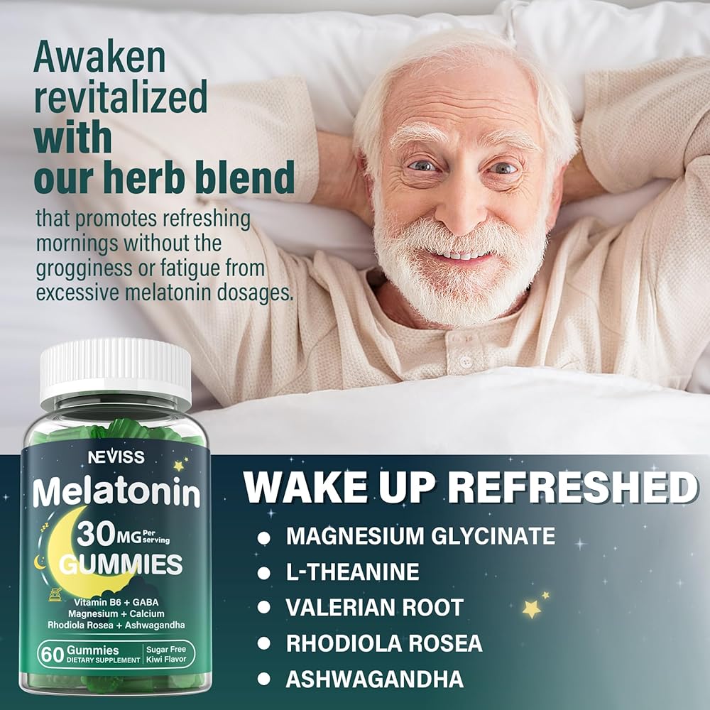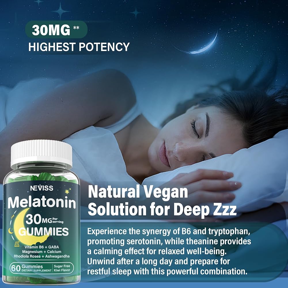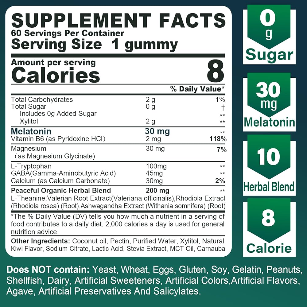 مضغ الميلاتونين بقوة إضافية 30 ملغ للبالغين، خالي من السكر مع جليسينات المغنيسيوم، فيتامين ب 6، إل تريبتوفان، جذر فاليريان، أشواغاندا من أجل Zzz العميق، دورة الراحة الصحية، الاسترخاء، نكهة الكيوي 60 قطعة