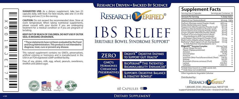 Research Verified IBS Relief contains key natural digestive enzymes and natural soothing herbs to provide fast, safe and effective relief from symptoms of IBS and prevent future bouts. Added Bioperine works to aid bioavailability and speed up effective results. It contains clinically proven key ingredients in the correct daily doses for optimal results. It is 100% pure, without any fillers, binders, additives or preservatives.